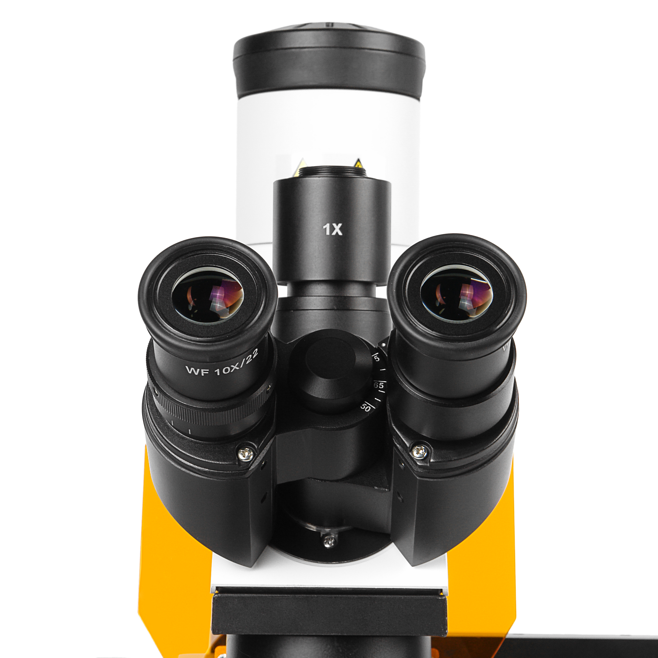Тринокулярная визуальная насадка снабжена окулярными тубусами с наклоном 30°, это способствует комфортной работе на микроскопе и снижает нагрузку на шейный отдел позвоночника исследователя. Для компенсации аметропии глаз исследователя левый окулярный тубус снабжен механизмом диоптрийной настройки в диапазоне ±5 дптр. Благодаря конструкции Зидентопфа насадка допускает настройку межзрачкового расстояния без потери точной фокусировки в пределах 50-75 мм разворотом окулярных тубусов.