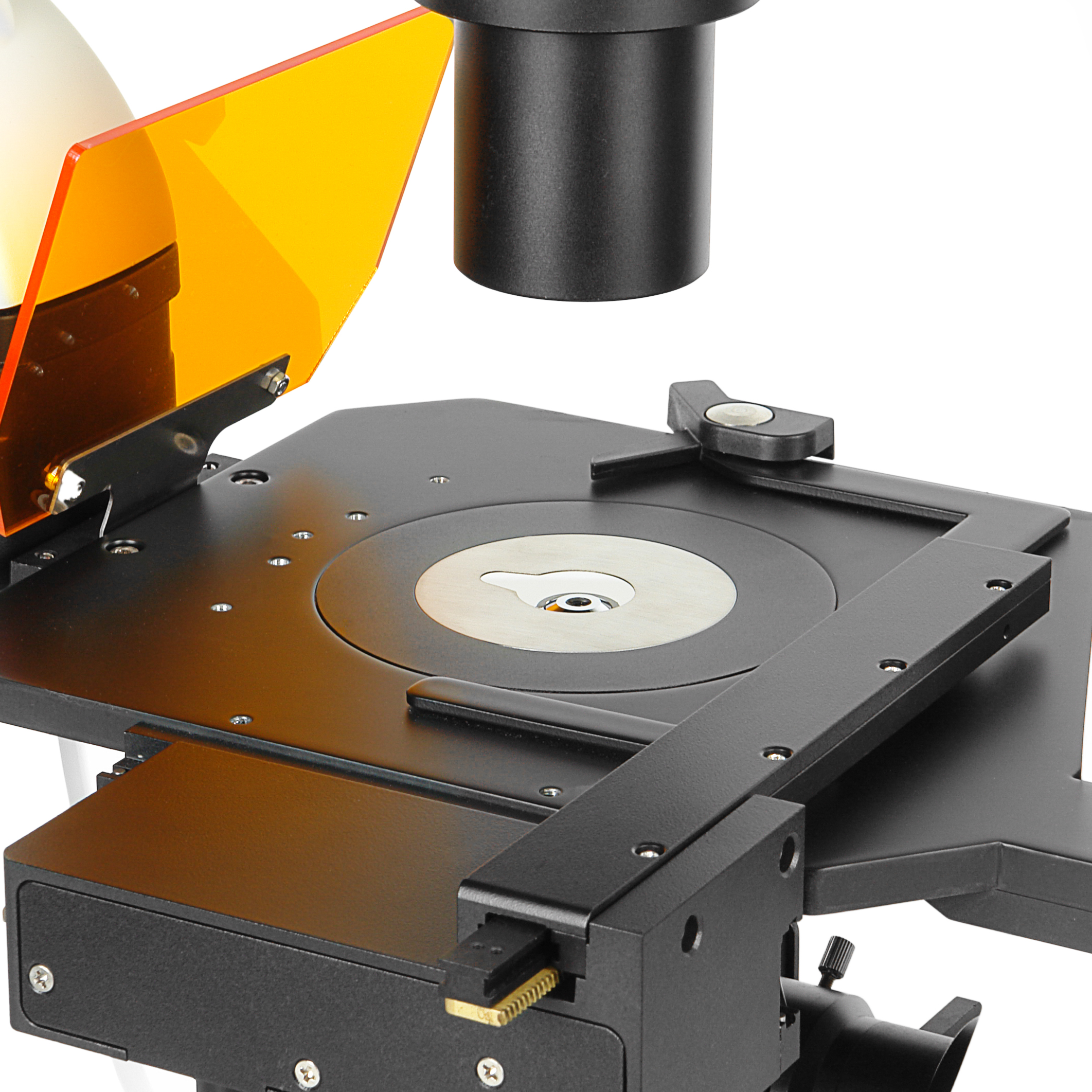 Микроскоп имеет инвертированное строение и оборудован неподвижным предметным столиком увеличенного размера 200х235 мм. Панель столика изготовлена из твердого алюминиевого сплава толщиной 10 мм и предназначена для размещения крупных объектов массой до 5 кг. В комплекте микроскопа металлические предметные вставки – круглая Ø110 и прямоугольная 128х86 мм. Столик комплектуется съемным механическим препаратоводителем обеспечивающим перемещение объекта в направлениях X и Y в диапазоне 120-80 мм. Перемещение осуществляется зубчато-реечными приводами с управлением коаксиальными рукоятками.
