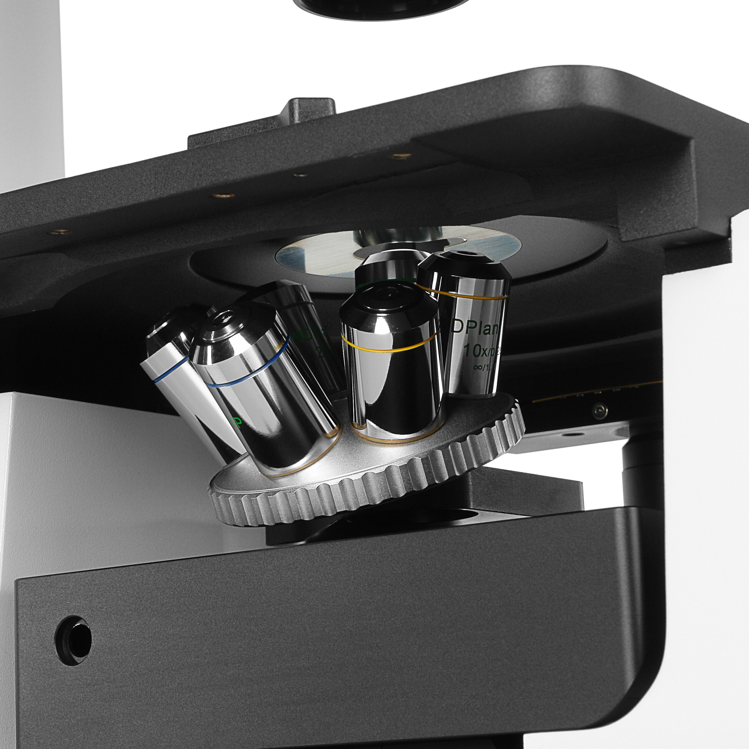 Все объективы скорректированы на бесконечность, имеют увеличенное рабочее расстояние и допускают исследования в лабораторной посуде с толщиной дна до 1,1 мм. На оптические детали нанесено многослойное антирефлексное и антигрибковое покрытие позволяющее без ограничений использовать микроскоп в биологических лабораториях. Объективы микроскопа установлены на револьверном устройстве, рассчитанном на 5 объективов.