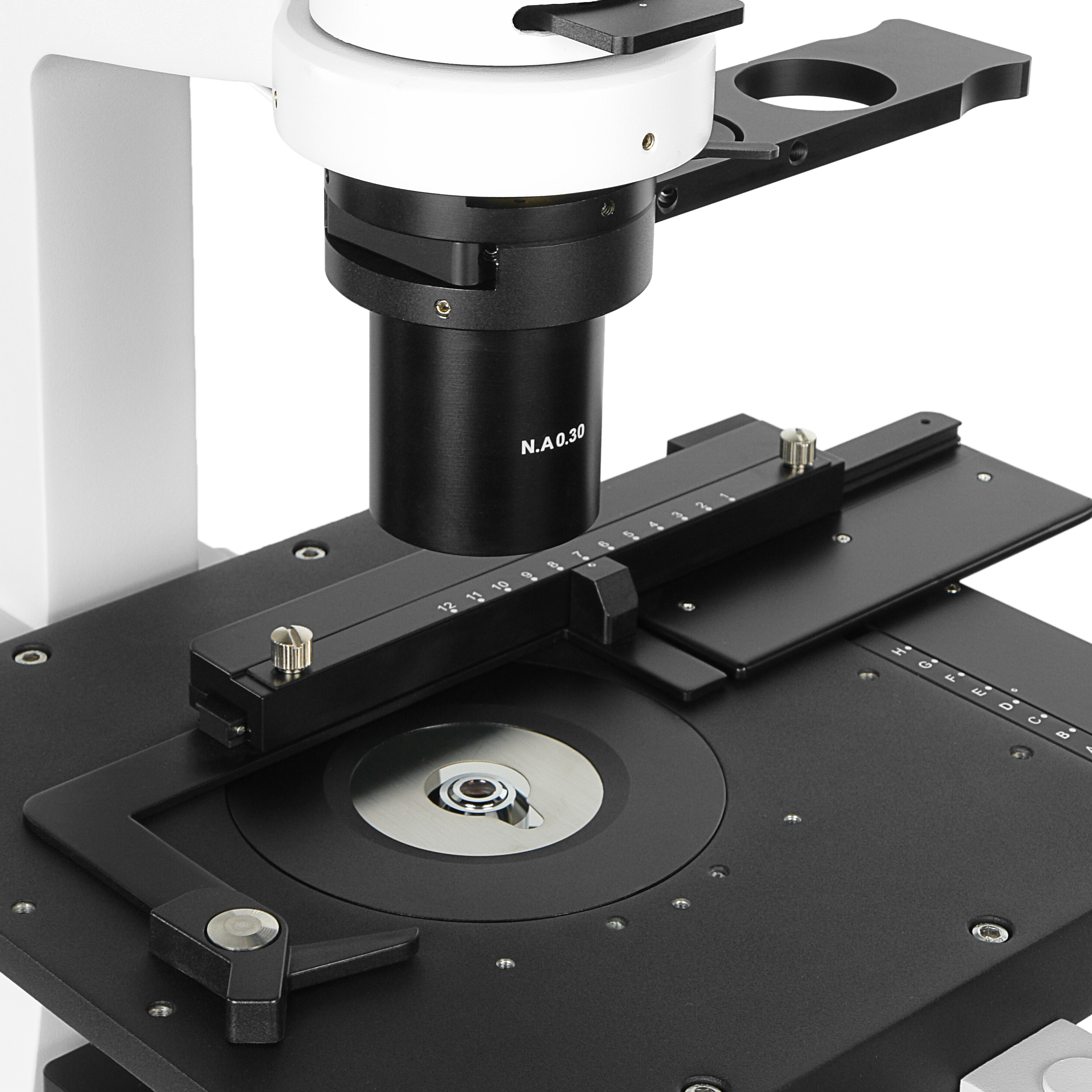 Инвертированный штатив и биологические объективы с большим рабочим расстоянием позволяют исследовать жидкие препараты в лабораторной посуде – кюветах и чашках Петри. Предметный столик, рассчитанный на нагрузку до 5 кг, позволяет применять микроскоп в промышленности и других областях, где необходимо проводить исследования крупных объектов.
