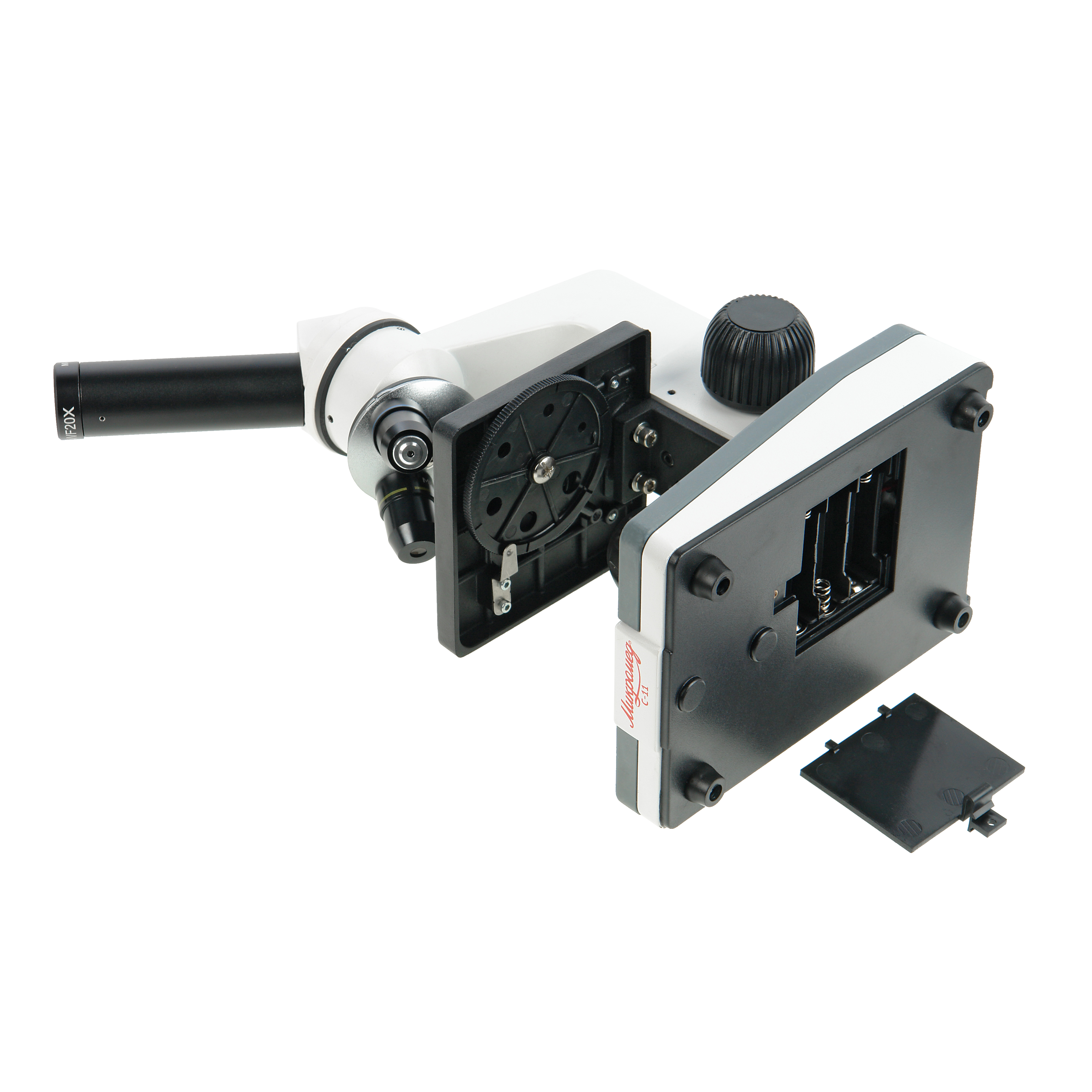 Осветитель снабжен коллекторной линзой, что повышает равномерность и яркость освещения предмета исследования. Питание микроскопа производится от 3-х щелочных батареек типа АА или от сетевого адаптера 5В. При необходимости, адаптер питания может быть приобретен дополнительно. Возможность питания микроскопа от батарей позволяет пользоваться микроскопом не только в учебном классе или дома, но и в любых ситуациях, когда электросеть недоступна.