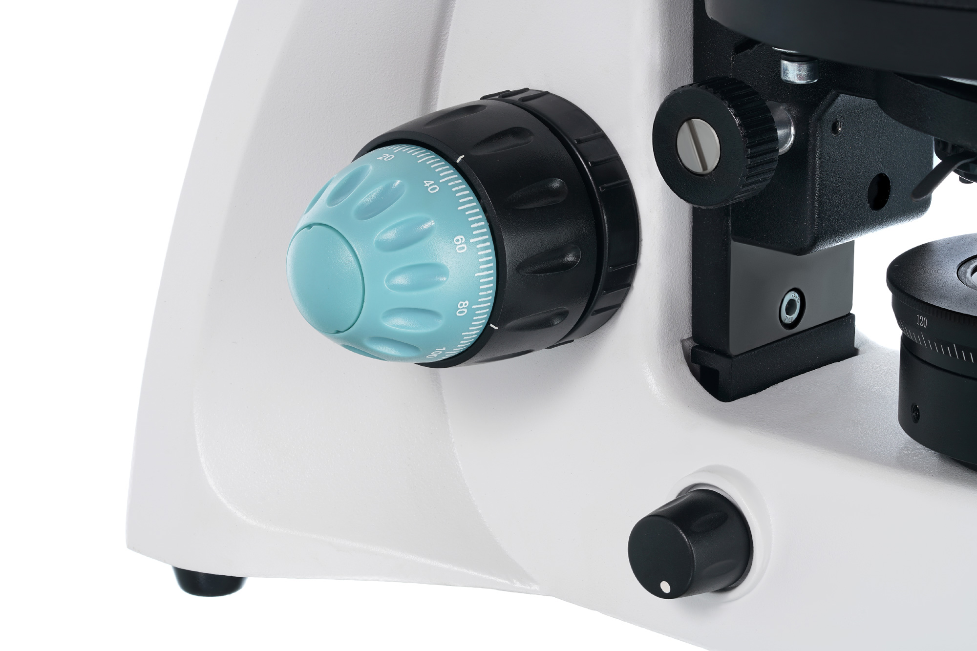 Предметный столик круглый и вращающийся, для фиксирования микропрепаратов используются классические зажимы. Под ним находится конденсор с ирисовой диафрагмой и держателем фильтра. В самом низу расположен блок подсветки – мощный 3-ваттный светодиод с коллектором. Яркость подсветки можно регулировать. Кроме того, в микроскопе есть встроенные поляризатор и анализатор.