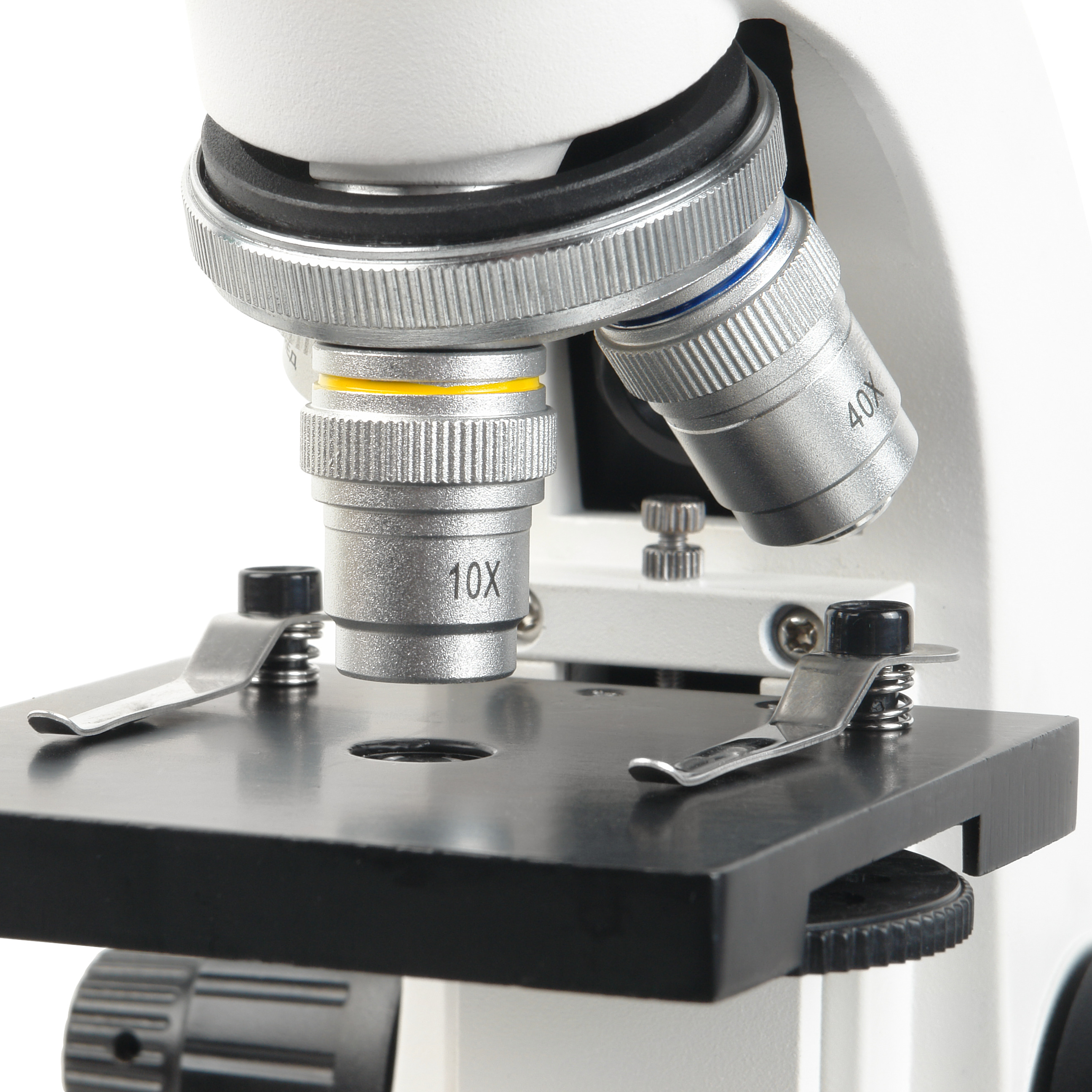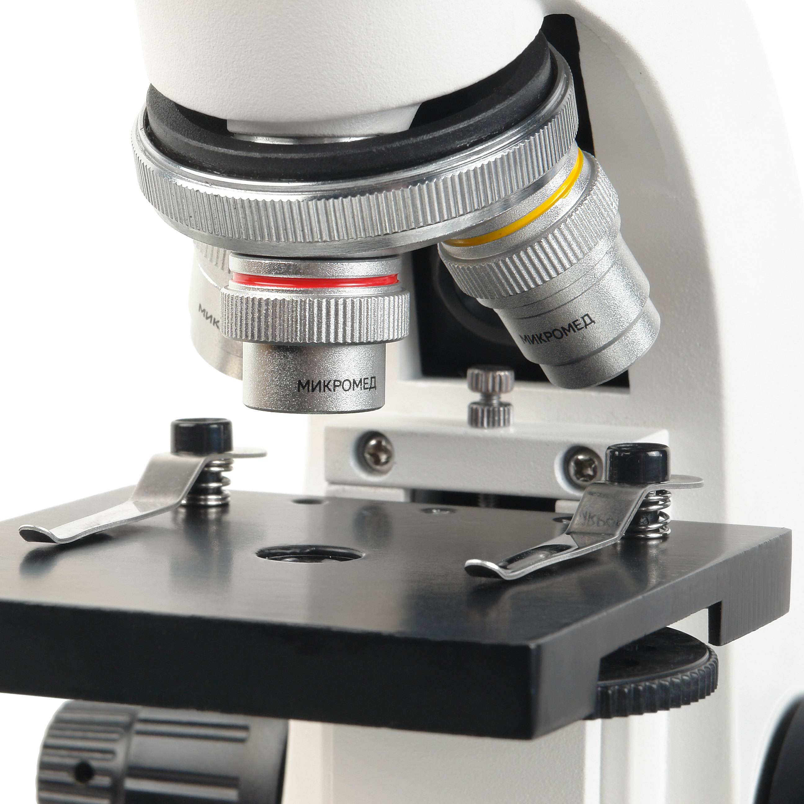 Объективы микроскопа установлены на револьверном устройстве, что позволяет наблюдателю быстро переходить к исследованиям с различными увеличениями. Объективы парфокальны, поэтому при смене увеличений наводка на резкость не теряется, требуется лишь незначительная подфокусировка.