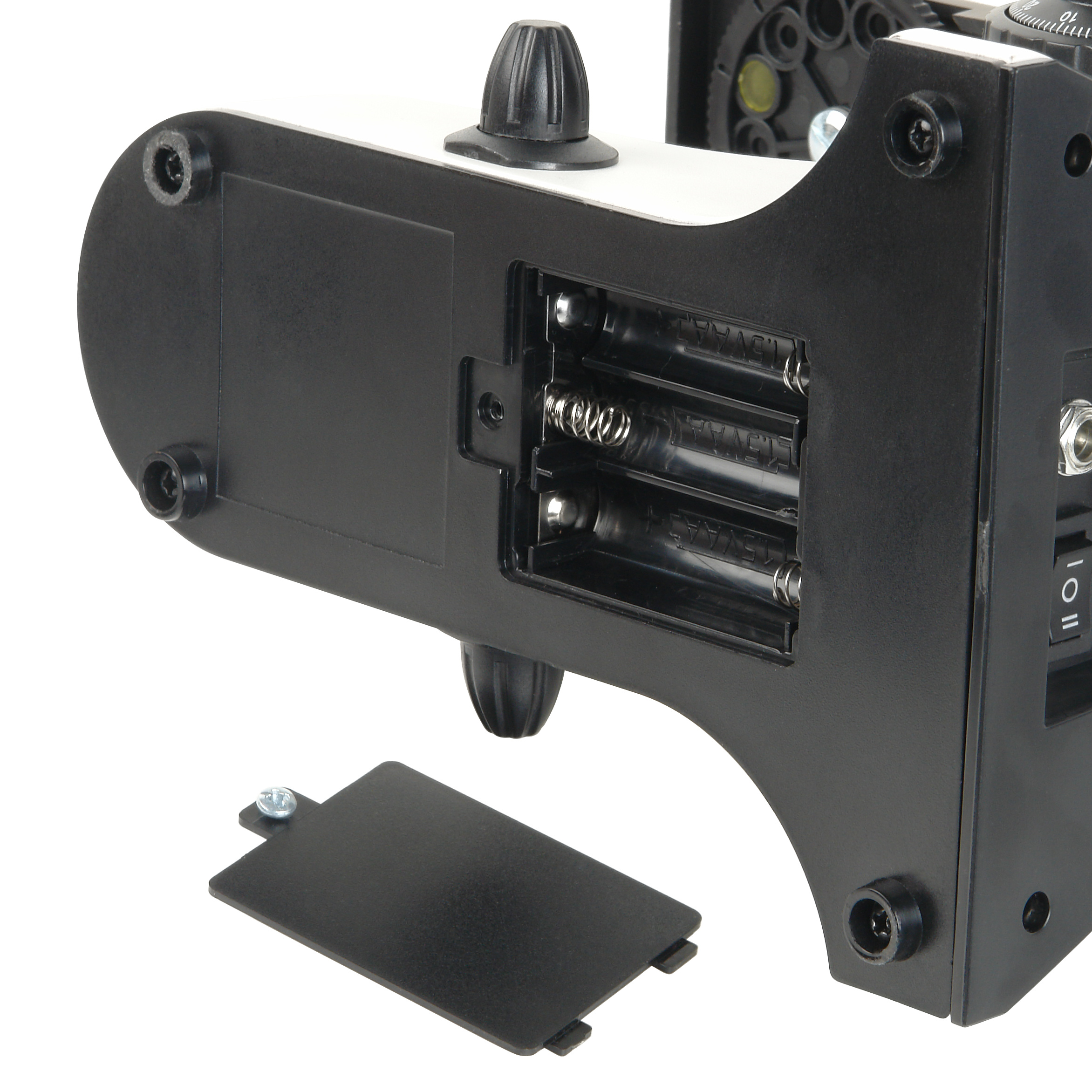- Штатив микроскопа с визуальный насадкой, наклонным окулярным тубусом, механизмом фокусировки, встроенными осветителями с регулировкой яркости, блоком питания, отсеком для батарей и револьверным устройством на 3 объектива – 1 шт