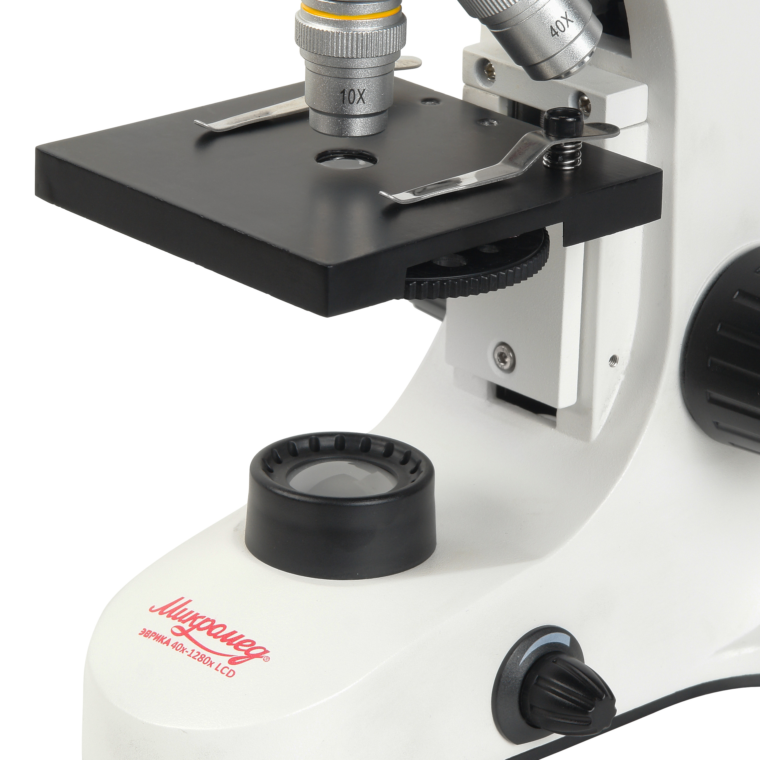 Фокусировка микроскопа Эврика 40х-1280х LCD осуществляется перемещением предметного столика по вертикали. Предметный столик микроскопа имеет размер 90 мм х 90 мм и имеет пружинные зажимы – клипсы для фиксации исследуемого объекта. Фокусировочный механизм на основе зубчато – реечной передачи расположен в штативе микроскопа и имеет двухступенчатую конструкцию. Это обеспечивает как грубую фокусировку, так и тонкую, прецизионную фокусировку. Механизм снабжен коаксиальными рукоятками, выведенными на обе стороны штатива, и имеет ограничитель перемещения, что препятствует повреждению исследуемого образца и объектива.