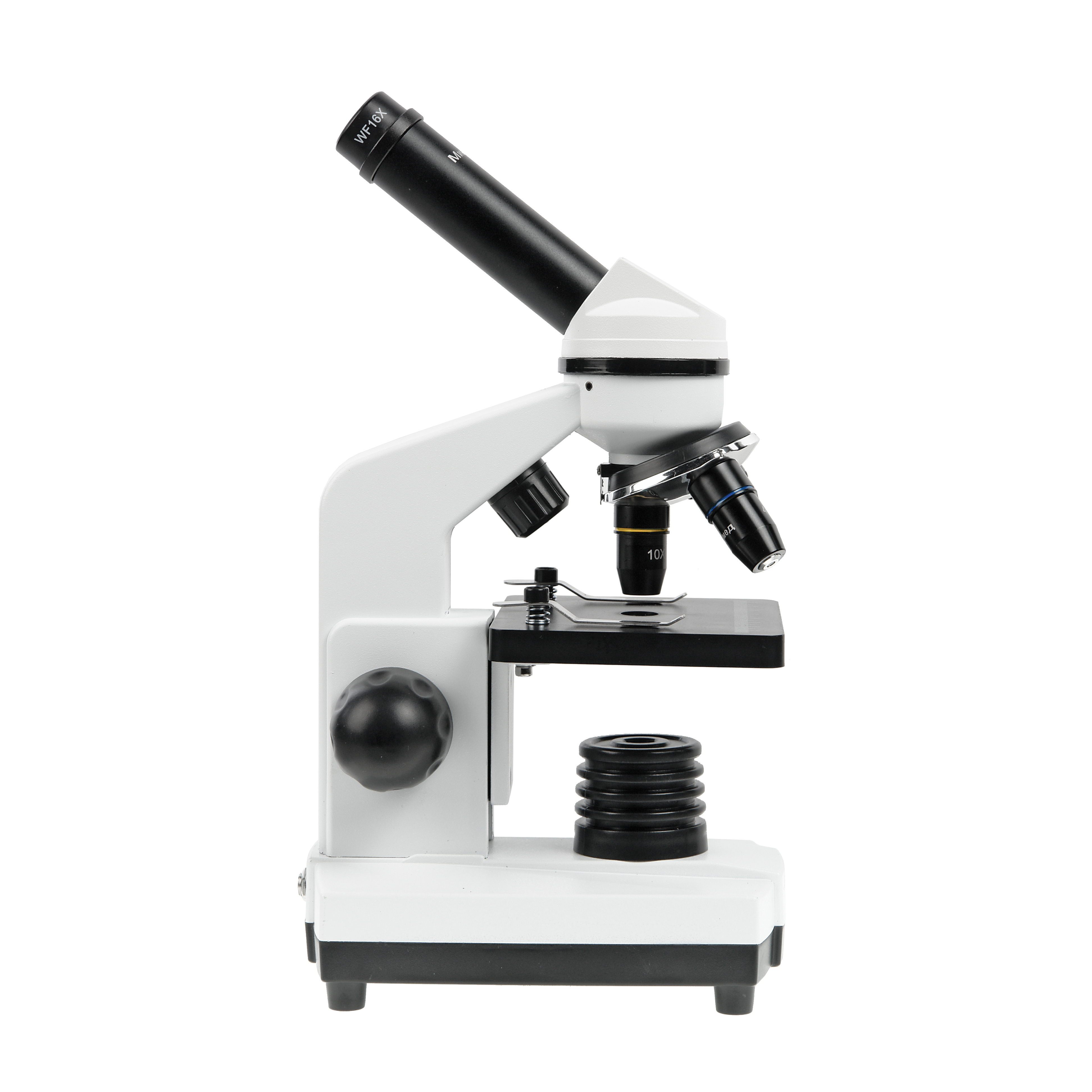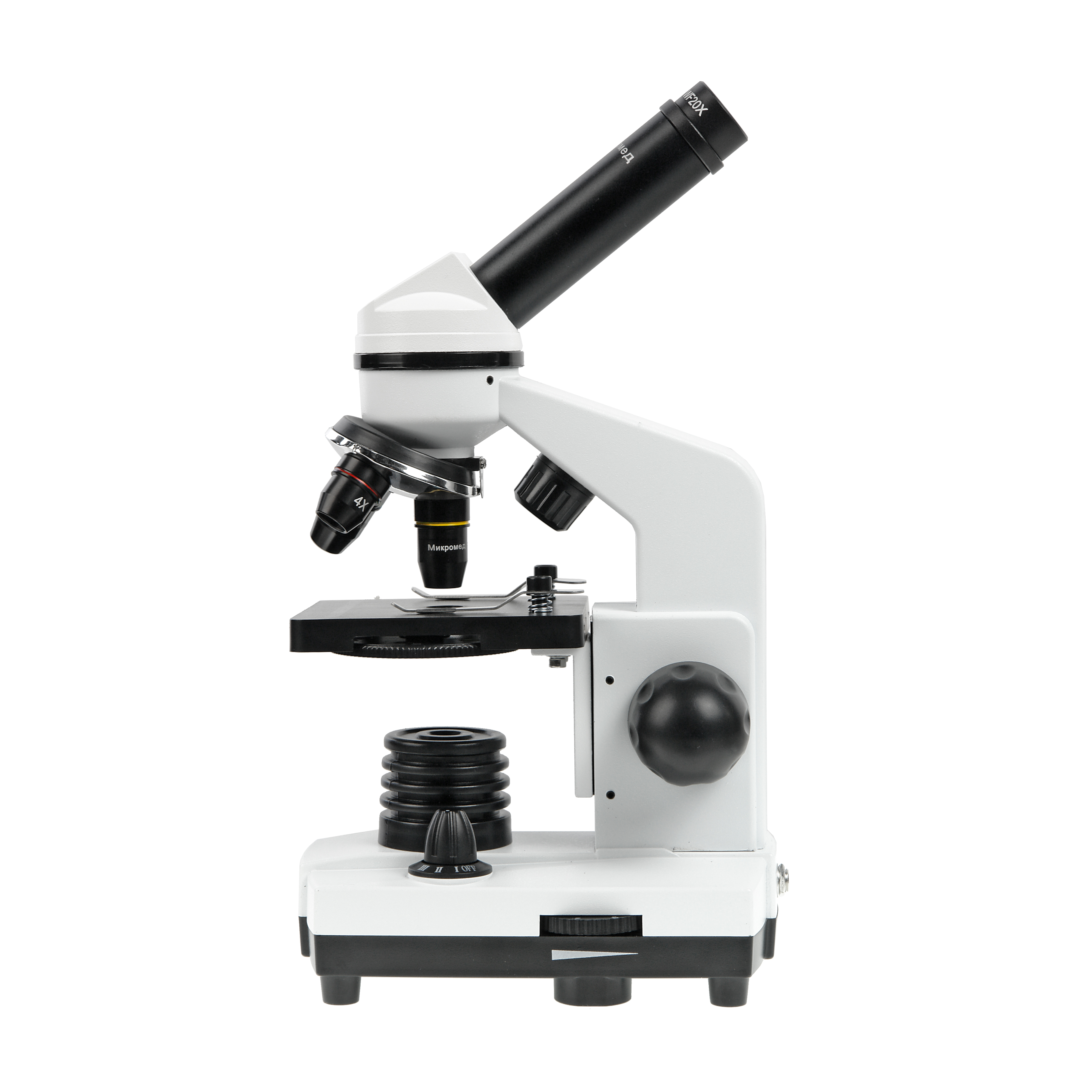 Микроскоп комплектуется ахроматическими объективами для сухих исследований – 4x/0.1, 10x/0.25 и 40x/0.65. Объектив 40x/0.65 имеет конструкцию оправы с подпружиненным оптическим блоком, что препятствует повреждению объектива и изучаемого образца. Все оптические элементы микроскопа - объективы и окуляры изготовлены из оптических стекол высокого качества и имеют просветляющее покрытие на оптических поверхностях.
