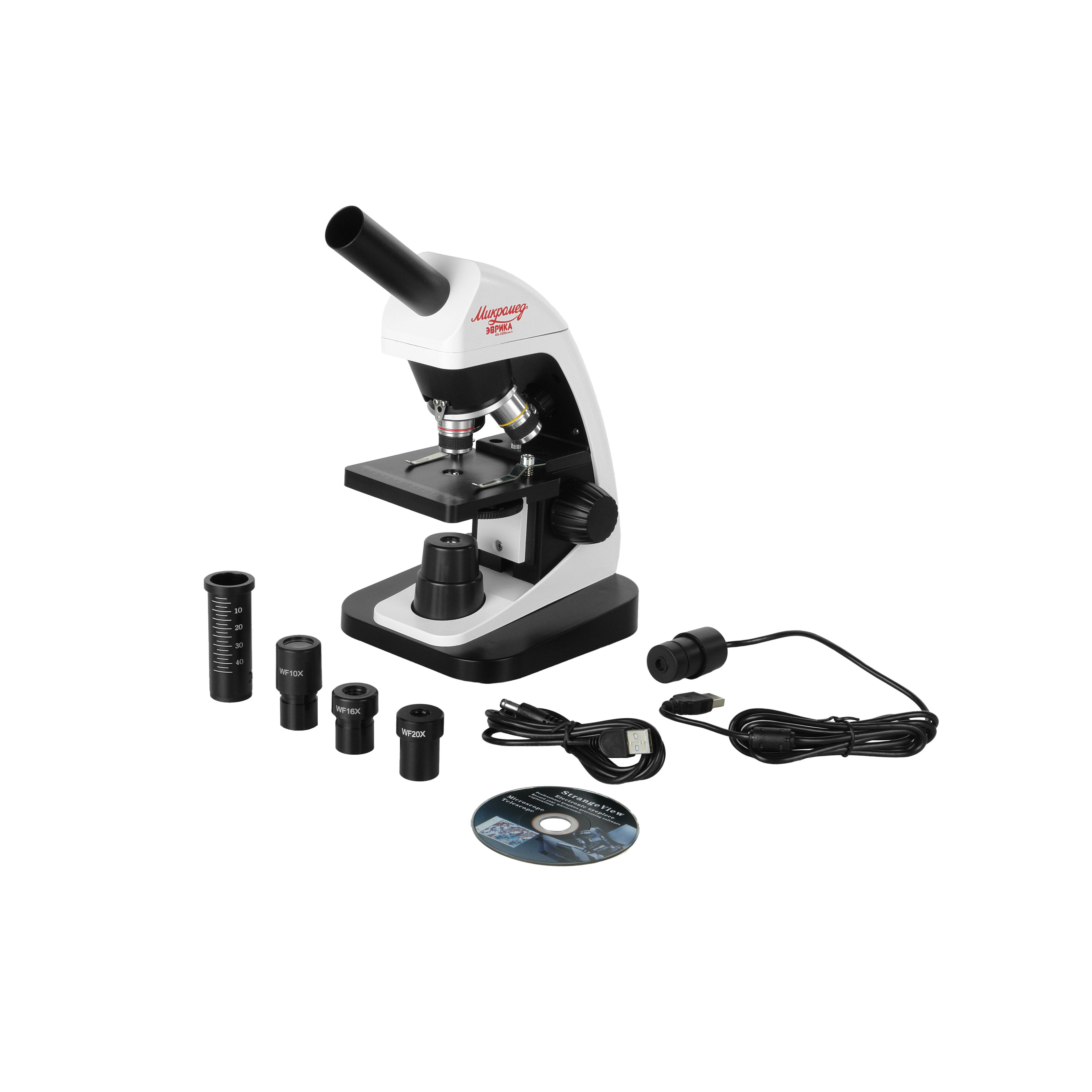 Микроскоп Эврика 40х-1600х (вар. 3) с видеоокуляром – бюджетный цифровой микроскоп из линейки учебных микроскопов Микромед. За счет наличия в комплекте цифрового видеоокуляра световой микроскоп в считанные секунды превращается в цифровой – просто нужно заменить оптический окуляр на видеоокуляр.
