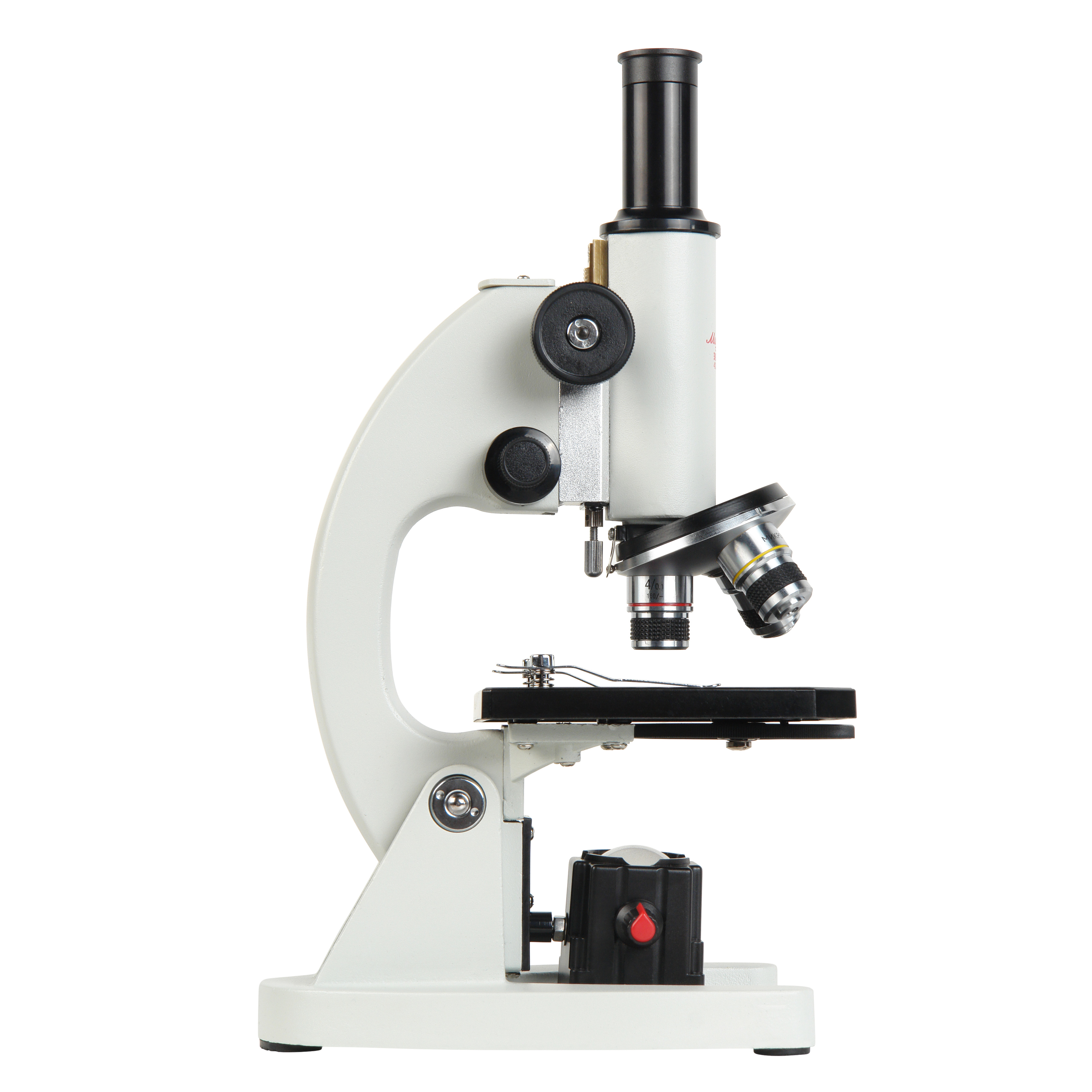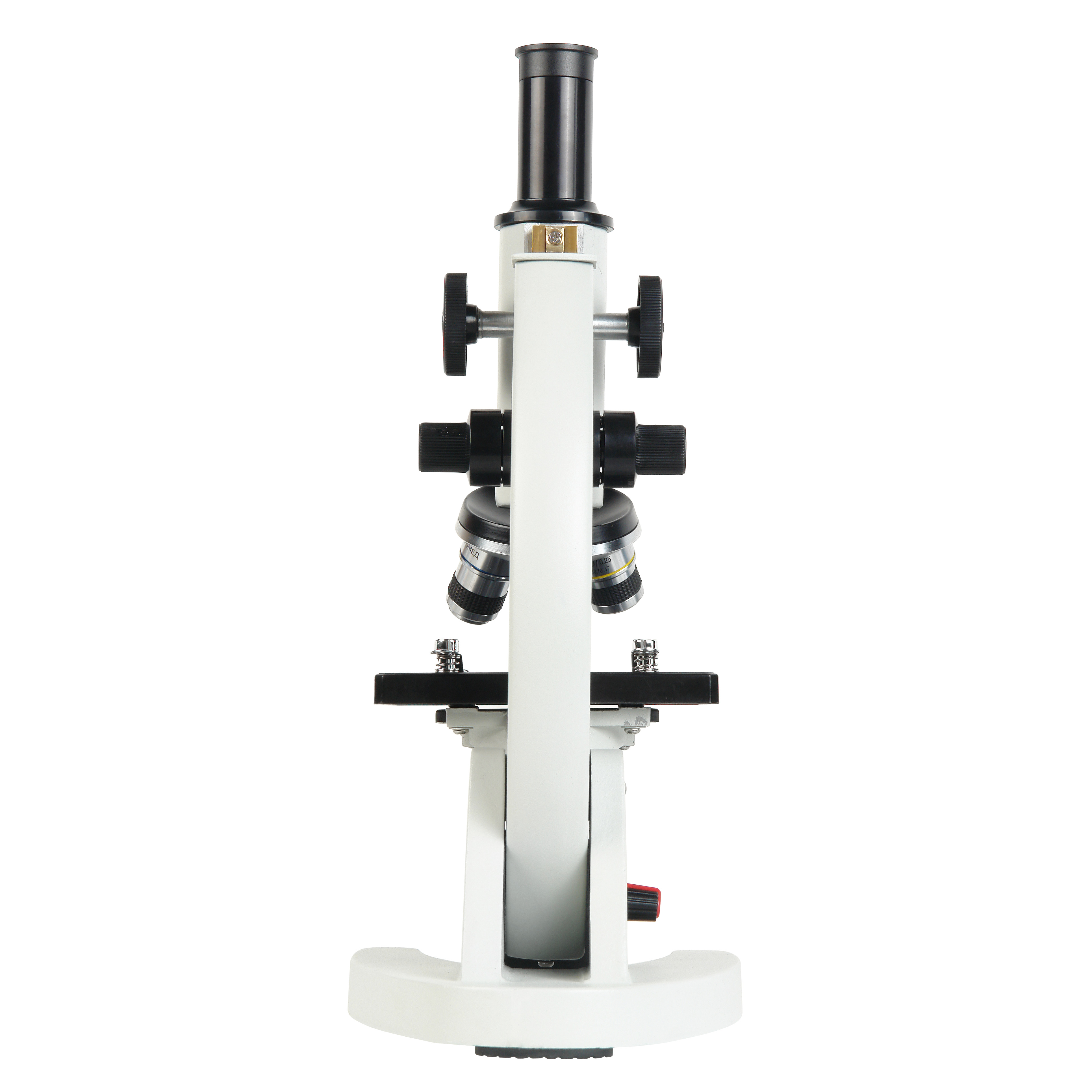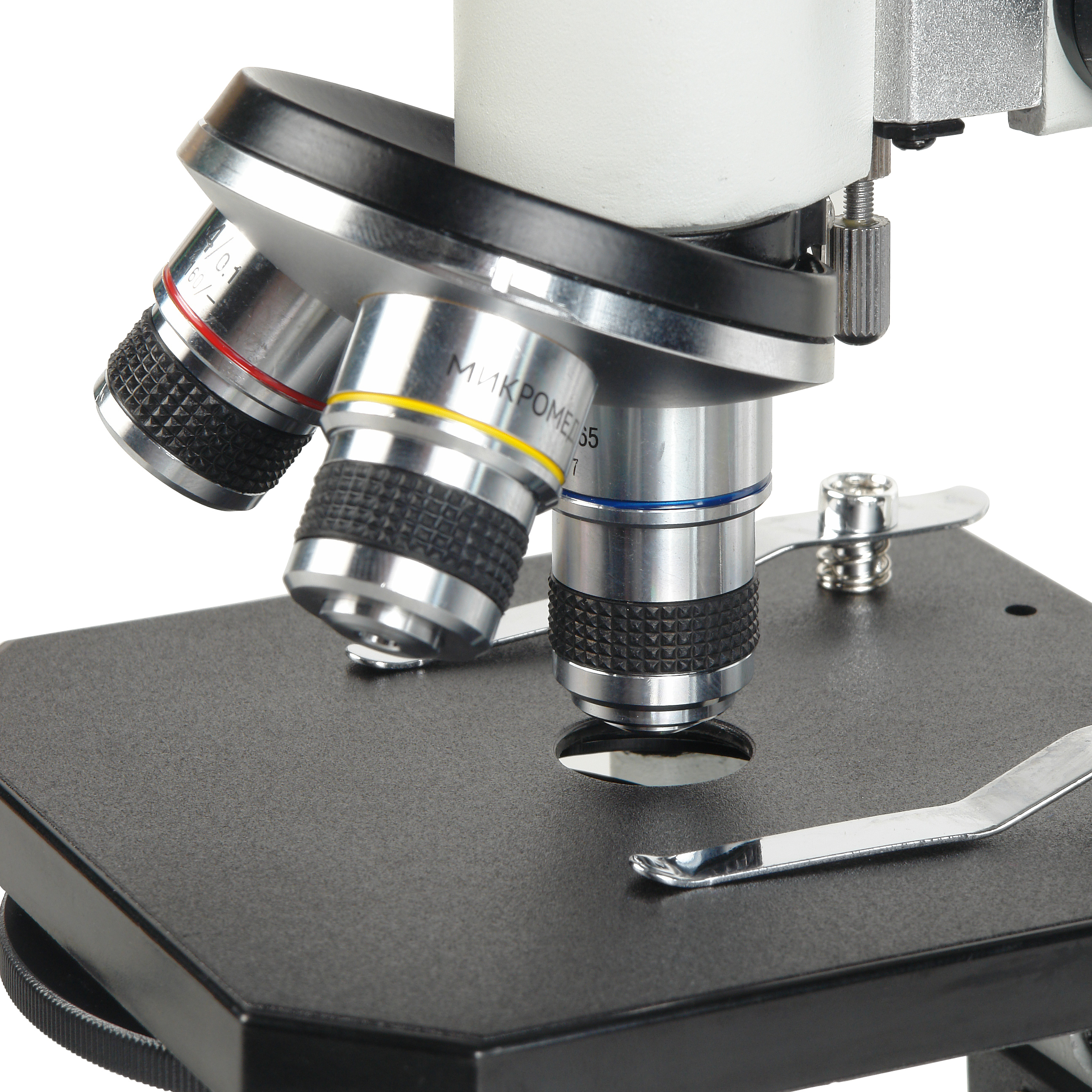 Микроскоп оснащен «сухими» ахроматическими объективами с линзами из оптического стекла – 4x/0.1, 10x/0.25 и 40x/0.65. Это позволяет наблюдать в окуляр отчетливое и яркое изображение, а при использовании дополнительной камеры записывать изображения и видео отличного качества. Объектив 40x/0.65 имеет оправу с подпружиненным оптическим блоком, что препятствует повреждению оптики объектива и изучаемого образца. Просветляющее покрытие на всех оптических поверхностях обеспечивает высокий контраст и малый уровень рассеивания света. Все объективы парфокальны, и при смене увеличений резкость не теряется, требуется лишь небольшая тонкая подфокусировка. Объективы имеют рабочую высоту 33 мм и рассчитаны на использование стандартных покровных стекол с толщиной 0.17 мм. Объективы установлены на револьверном устройстве, рассчитанном на 3 объектива, это позволяет наблюдателю быстро переходить к исследованиям с различными увеличениями – для того, чтобы установить нужный объектив достаточно повернуть револьвер до щелчка.