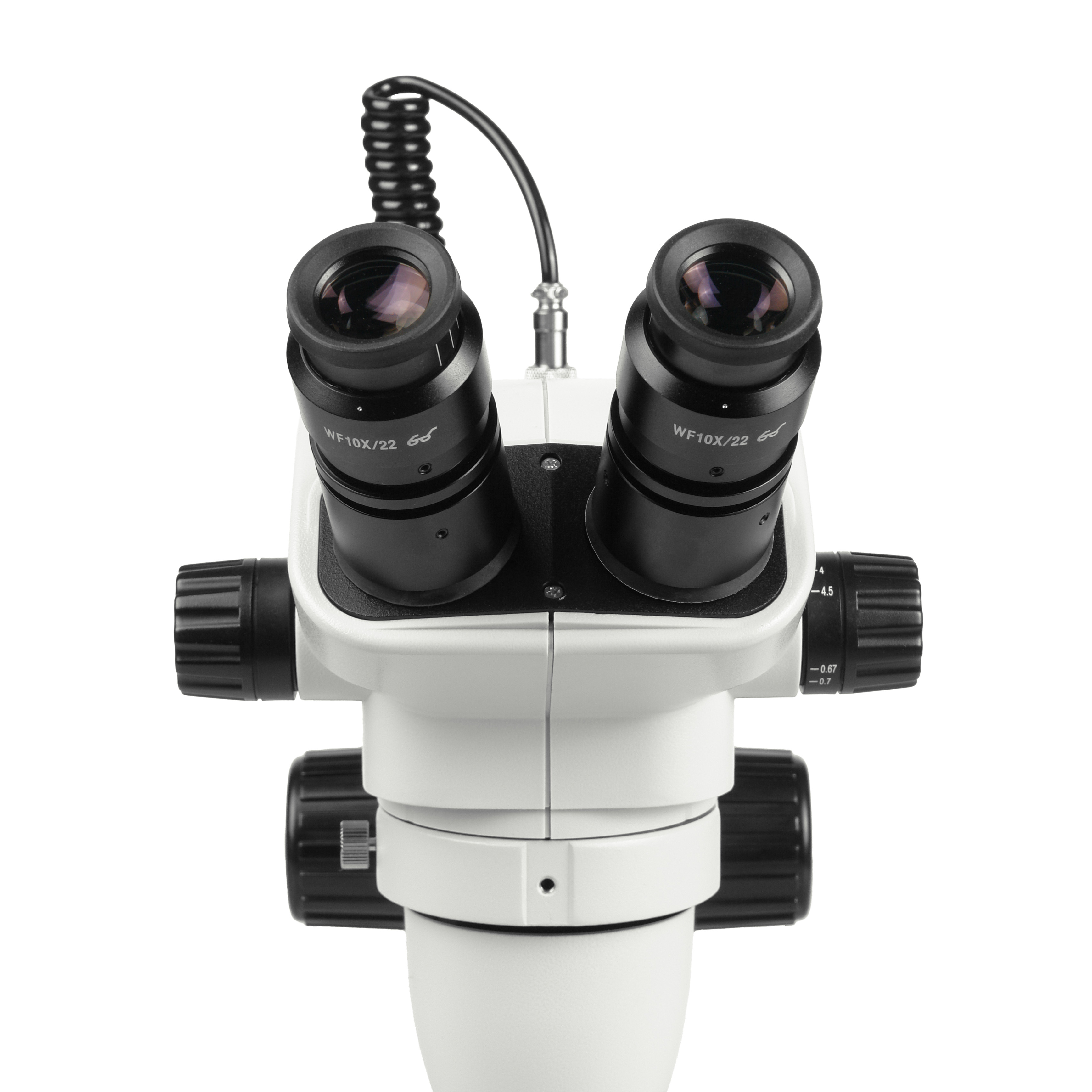 Микроскоп комплектуется окулярами широкого поля WF 10х/22. Общее увеличение микроскопа с ними составляет от 6.7х до 45х. Окуляры имеют конструкцию с вынесенным выходным зрачком, что позволяет вести комфортное наблюдение как в очках, так и без них. Каждый окуляр микроскопа снабжен собственным механизмом диоптрийной коррекции. Для микроскопа доступны разнообразные дополнительные окуляры с увеличением до 30х.