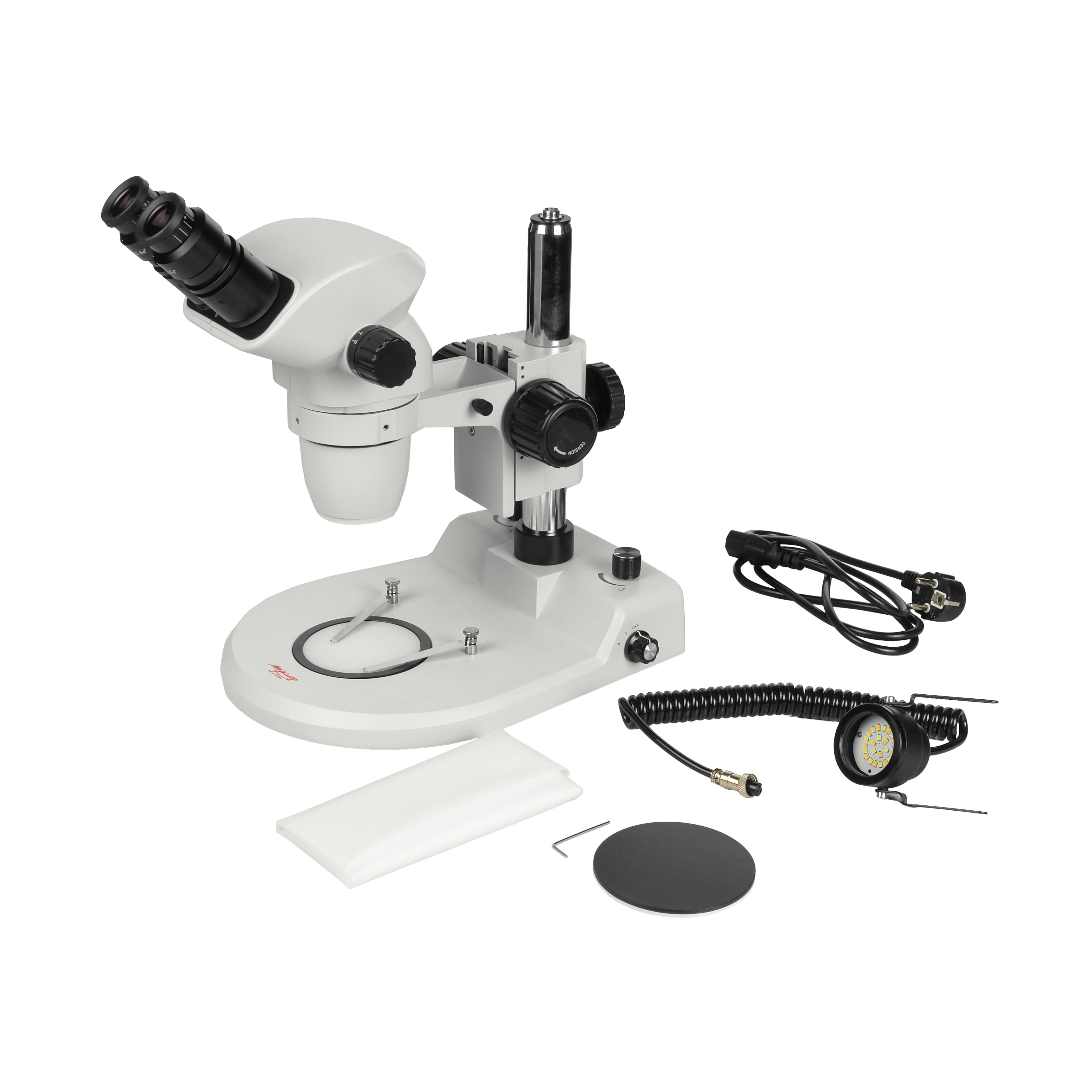 Осветитель проходящего света встроен в основание и имеет мощность 5 Вт. Для размещения объекта исследования применяются круглые вставки, устанавливаемые в гнездо основания.