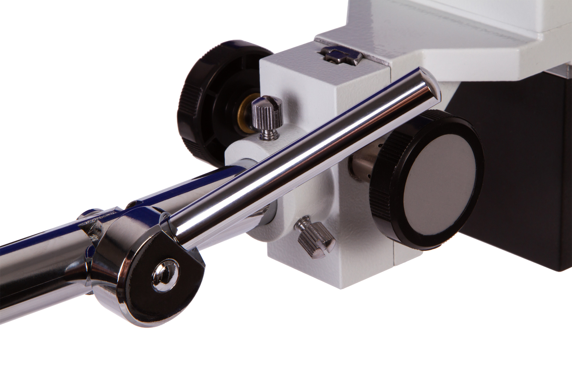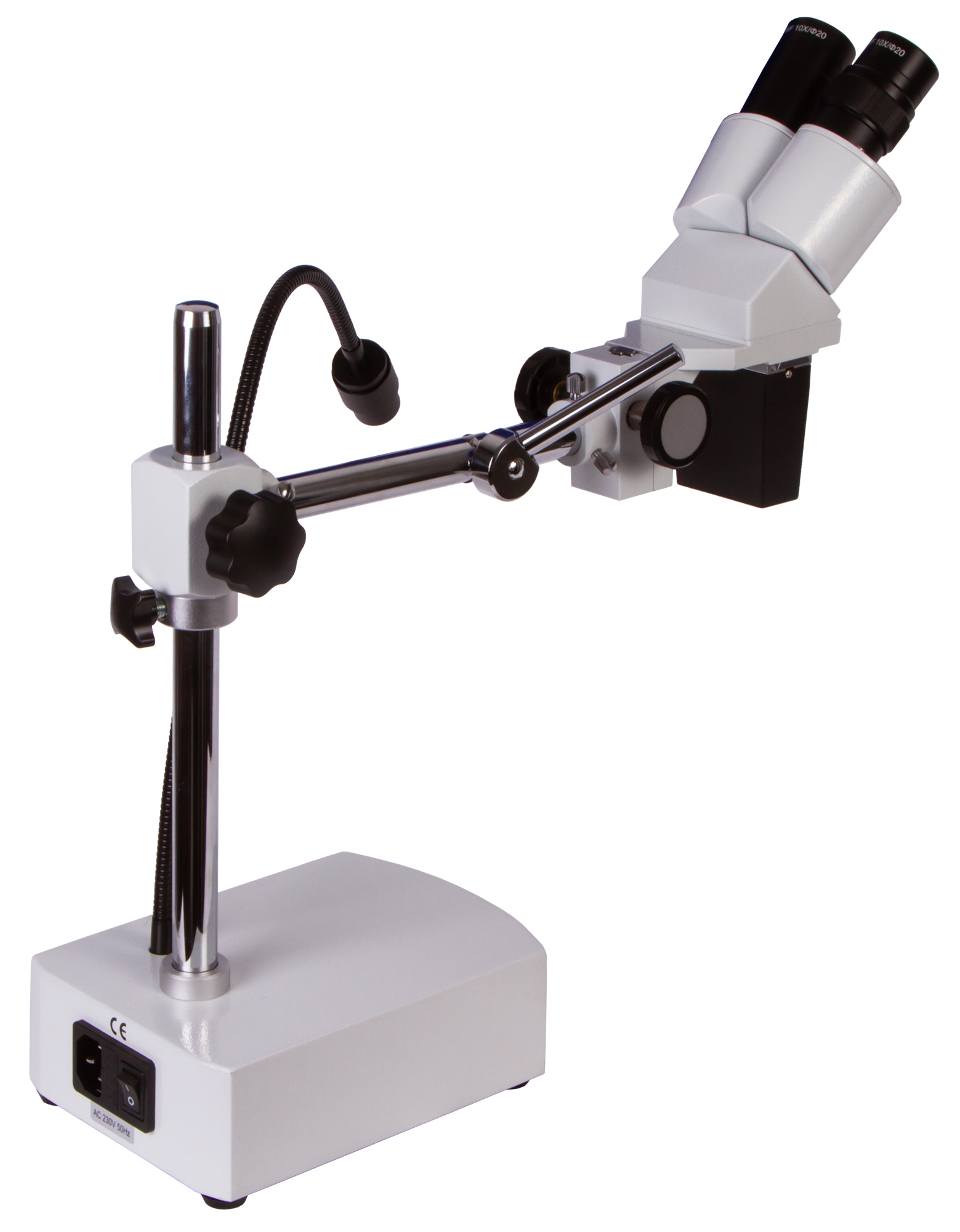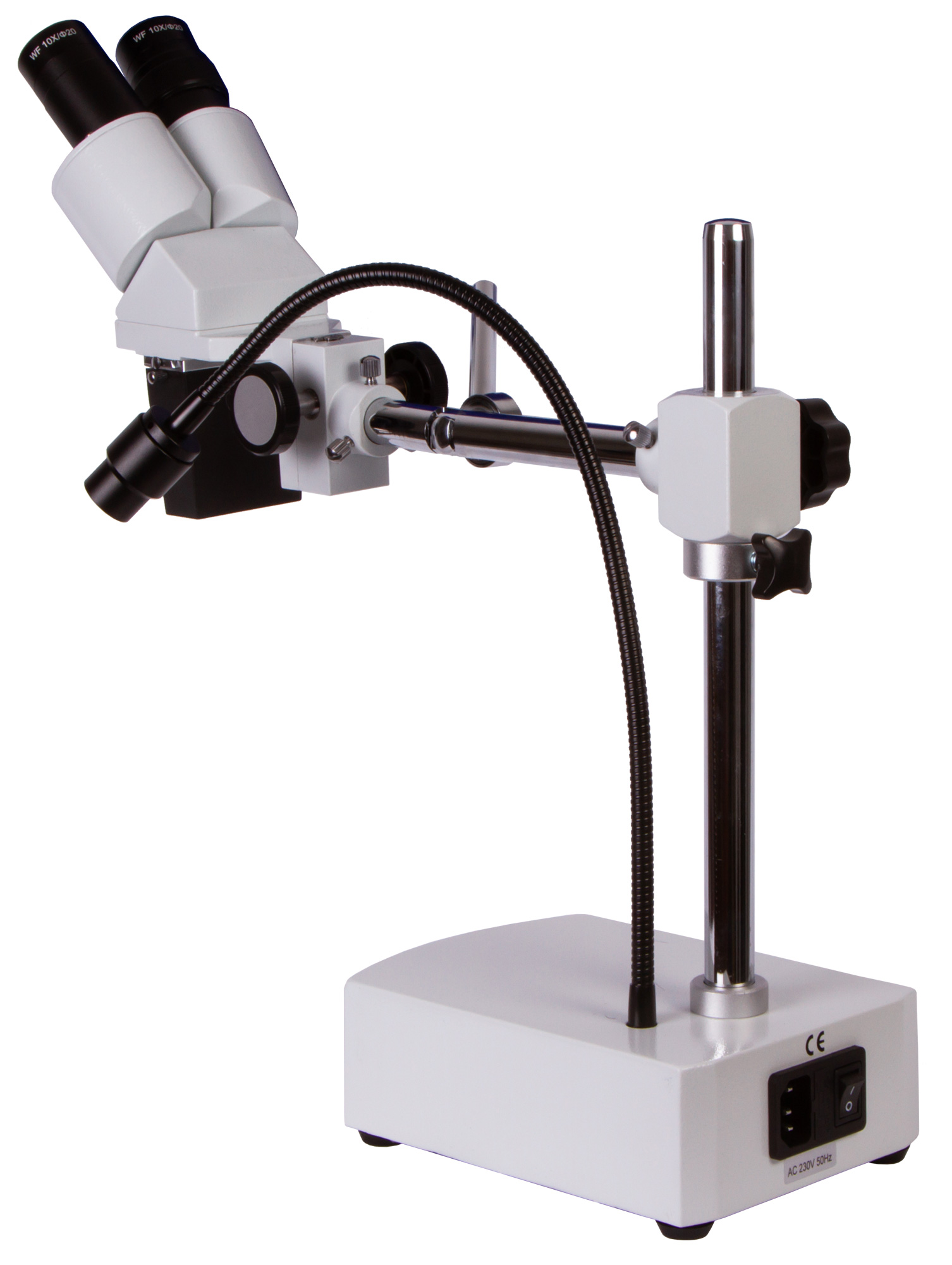 Микроскоп снабжен бинокулярной насадкой, парой широкоугольных объективов и тремя сменными объективами. Интересным образом устроен узел освещения – он представляет собой гибкий штатив с зафиксированным на его конце светодиодом. Яркость подсветки можно регулировать. Для ее питания используется сеть переменного тока.