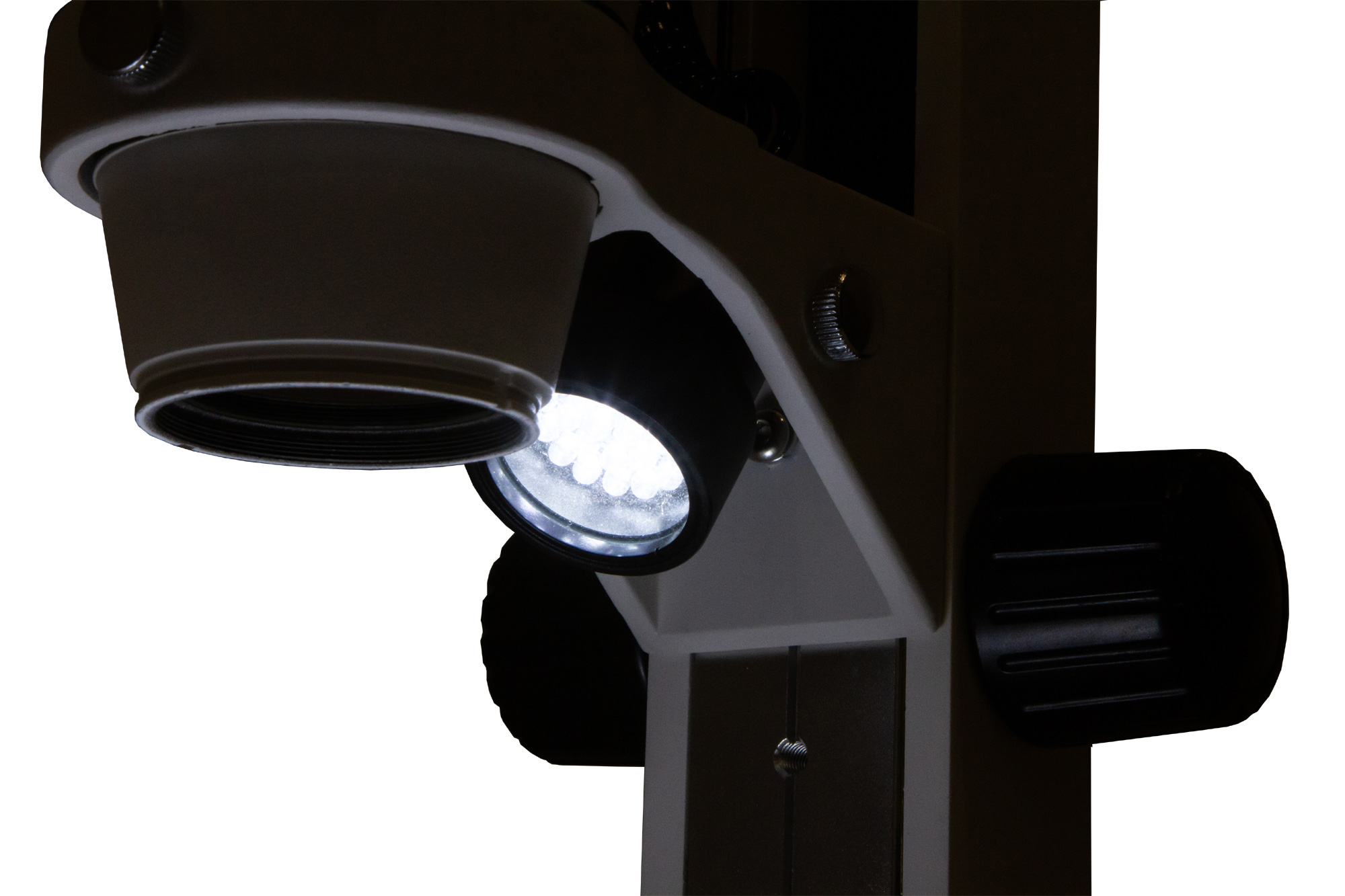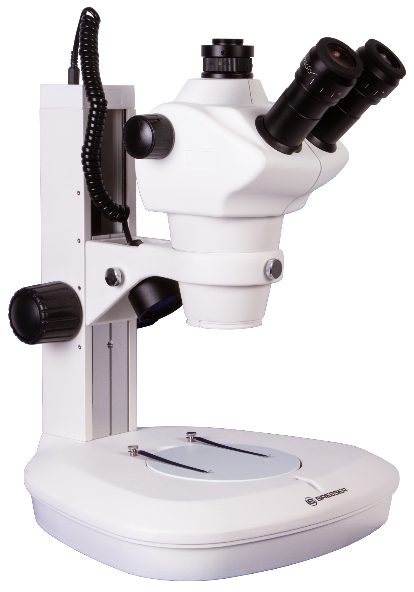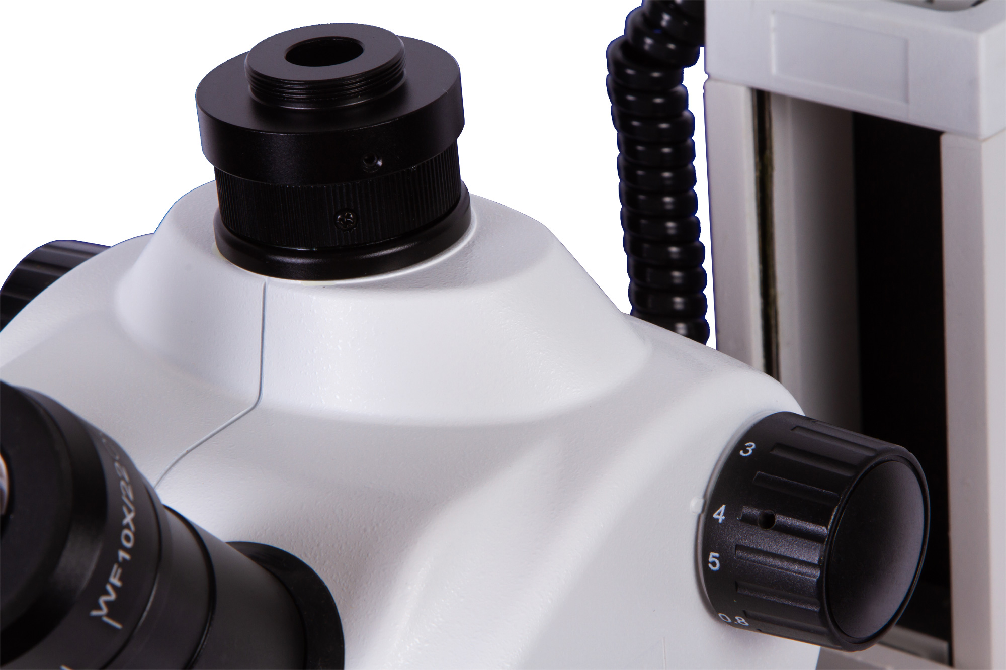 Тринокулярная насадка включает бинокулярный визуальный узел и отдельную вертикальную трубку для установки цифровой камеры (камера приобретается отдельно). В визуальную часть устанавливаются окуляры. Удобно, что они снабжены широкоугольной оптикой и имеют диоптрийную коррекцию. Объектив поворотный, причем его увеличение изменяется не дискретно, а плавно. Таким образом, общее увеличение микроскопа составляет от 8 до 50 крат.