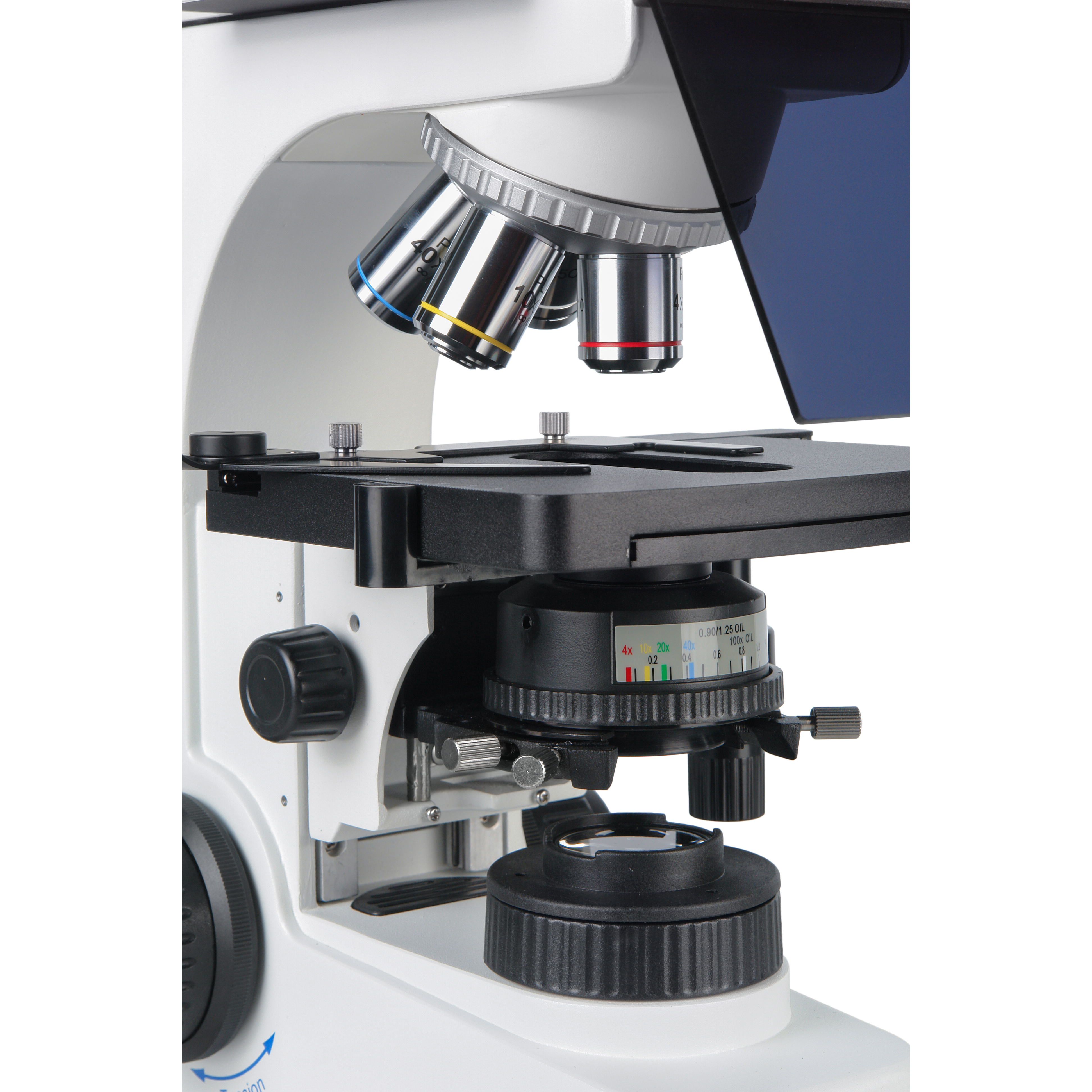 Благодаря исправленной кривизне поля и сферической аберрации объективов исследователь наблюдает плоское изображение с одинаково высокой резкостью по всему полю. В сочетании с исправленным для двух длин волн хроматизмом это обеспечивает высокую информативность, комфорт при наблюдении и отличное качество записываемых изображений. Объективы микроскопа установлены на револьверном устройстве, рассчитанном на 5 объективов.