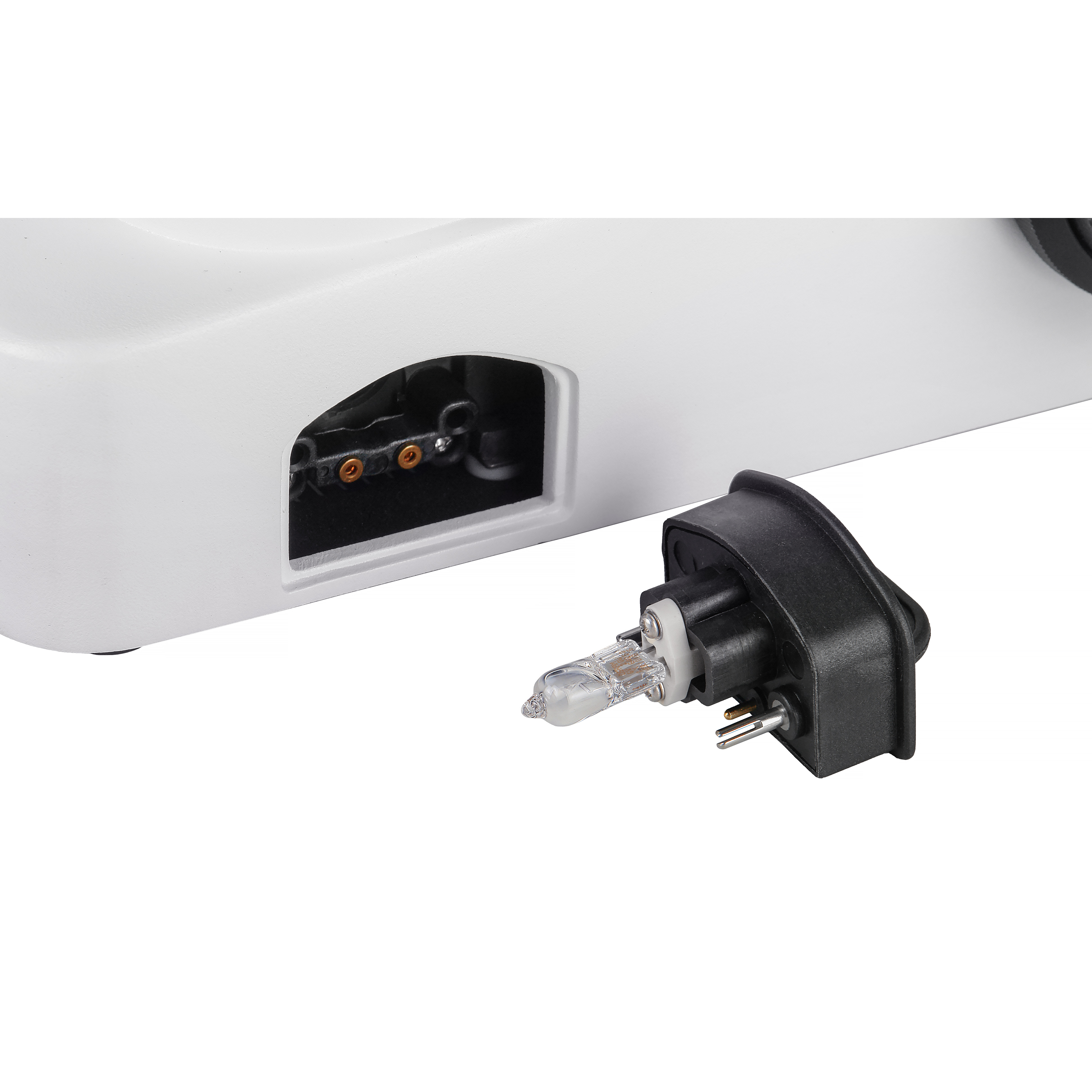 В конденсоре предусмотрен слот для дополнительных слайдеров. В качестве источника проходящего света используется галогенная лампа 20Вт на пониженное напряжение 6В.