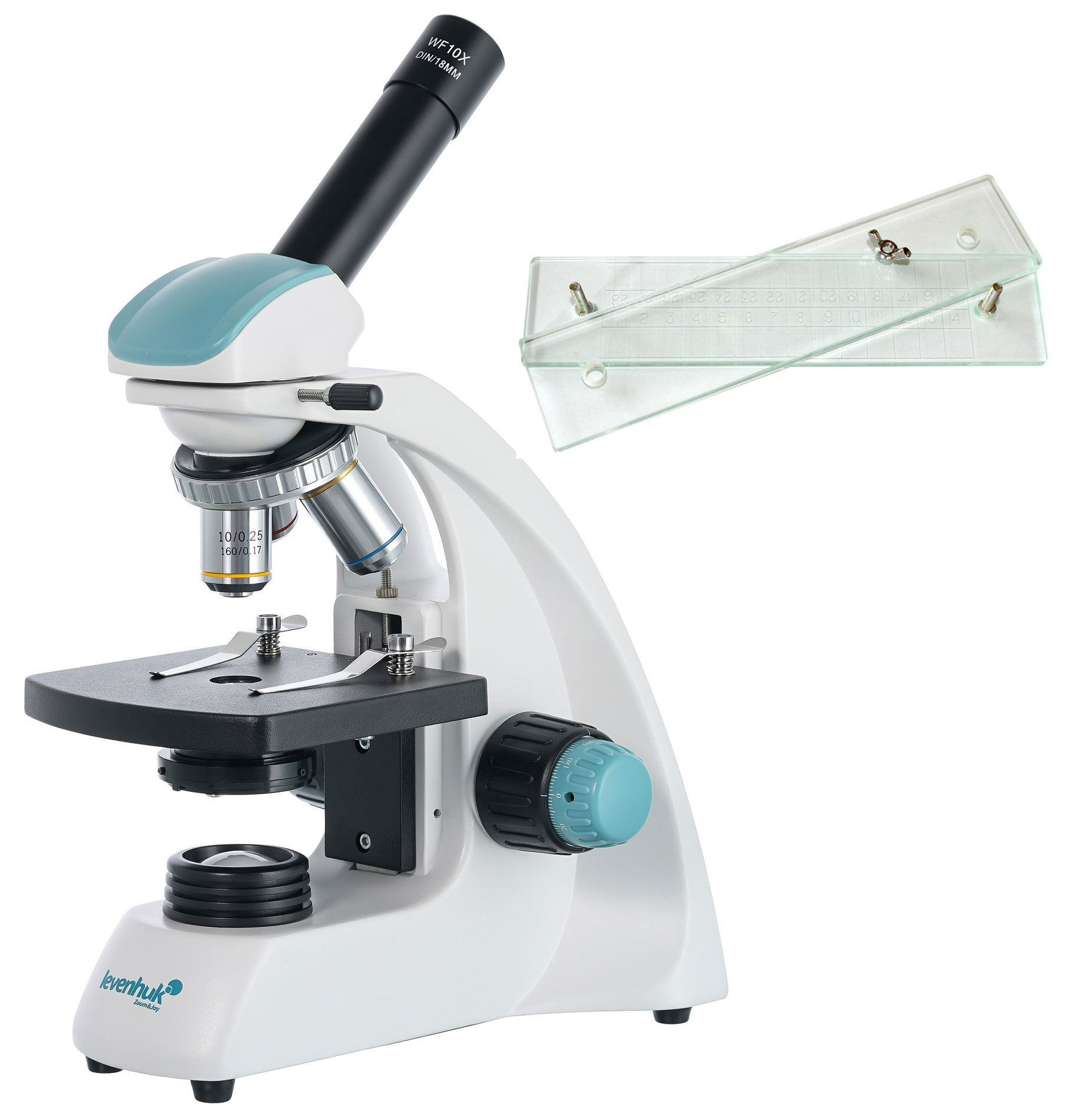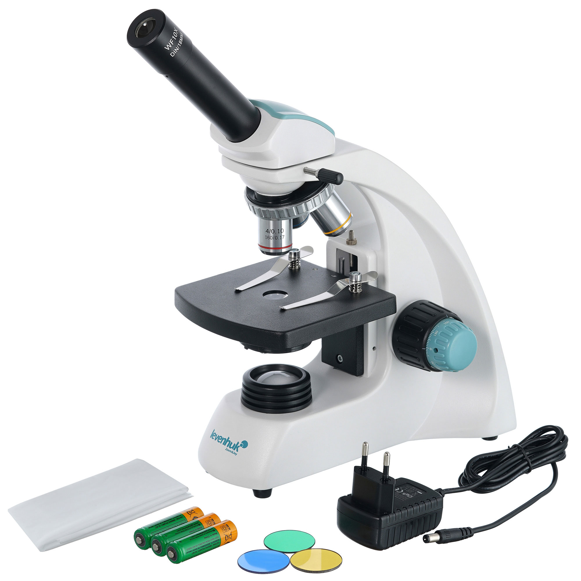 - Широкопольный окуляр с указателем центра поля и три объектива-ахромата, кратность 40–400х