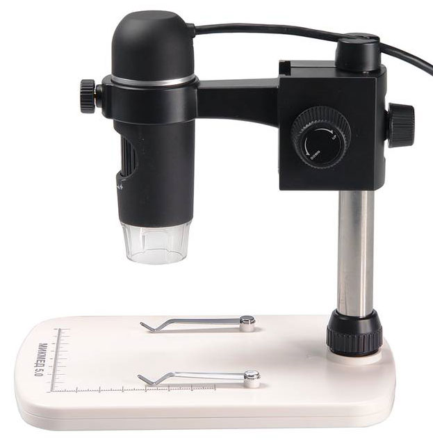 Цифровой USB-микроскоп со штативом Микмед 5.0 – цифровой оптический прибор с трехлинзовой ахроматической оптикой, предназначенный для хобби, учебы и работы. Он комплектуется устойчивым металлическим штативом и подходит для длительного изучения разных образцов. С помощью Микмед 5.0 можно рассматривать микропрепараты, насекомых и монеты, выполнять точные ремонтные работы, изучать дефекты поверхностей. Встроенная светодиодная подсветка с регулировкой яркости позволяет работать даже в слабо освещенных помещениях.