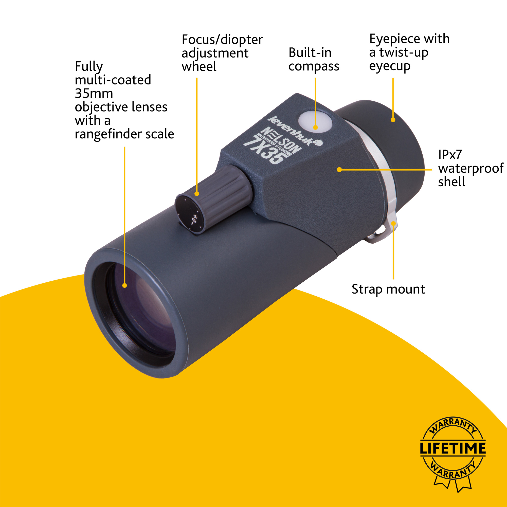 Морской монокуляр Levenhuk Nelson 7x35 пригодится рыболовам и любителям водных прогулок. Легкий и компактный прибор поместится даже в кармане. Семикратного увеличения достаточно, чтобы детально рассмотреть удаленные объекты. Небольшой оптический прибор обеспечивает широкое поле зрения – 130 м на расстоянии 1000 м. Минимальная дистанция фокусировки составляет всего 3 м, что позволяет изучать близкую береговую линию.