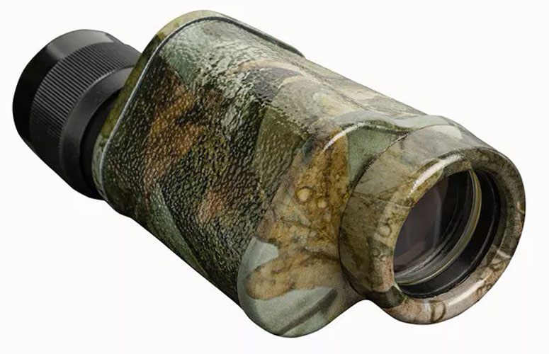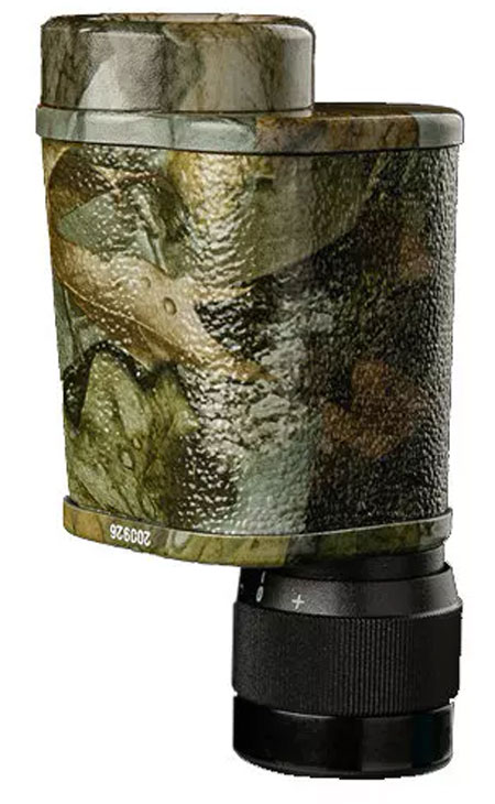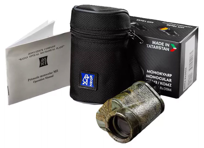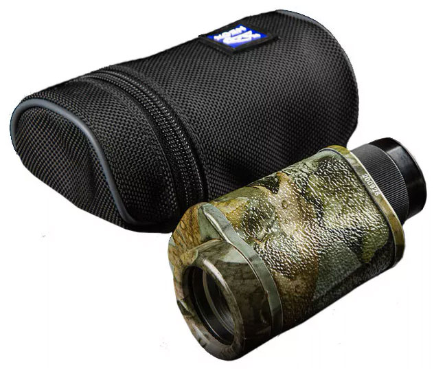 Легкий алюминиевый корпус прибора покрыт полимером камуфляжной окраски – за счет этого он остается незаметным на природе, не скользит в руках и защищен от влаги и пыли. В комплект поставки входит непромокаемый чехол для хранения и переноски. Он снабжен ремешком и проушиной для крепления на поясной ремень. Прибор фокусируется с помощью окулярного кольца и оснащен механизмом диоптрийной коррекции для большего комфорта при наблюдениях.