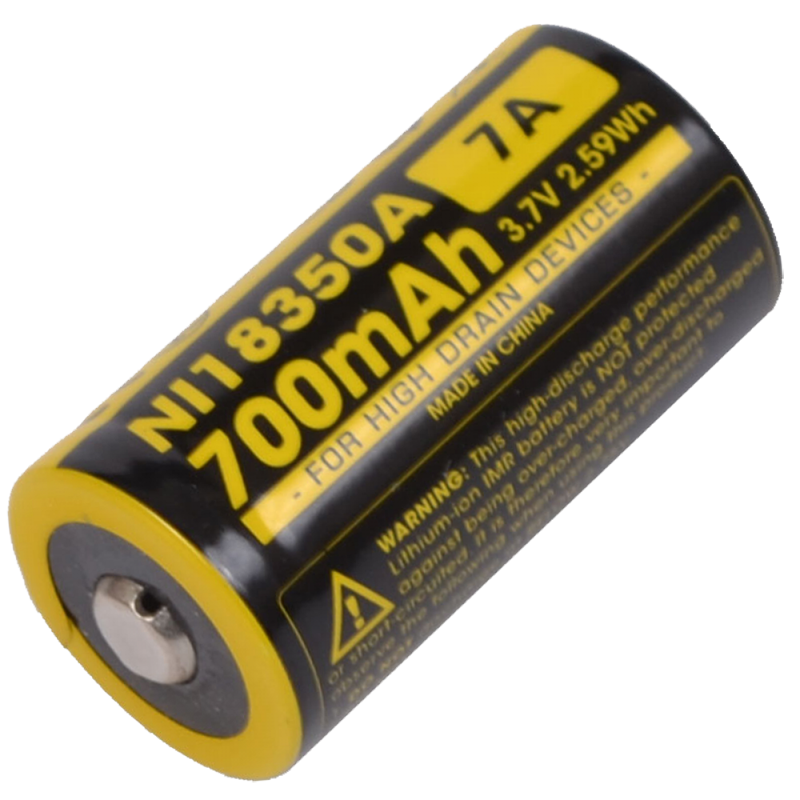 Nitecore NL18350A – это компактный высокотоковый литий-ионный аккумулятор с емкостью 700 мАч, выходным напряжением 3,7 В и максимальным импульсным разрядом на уровне 7 А.