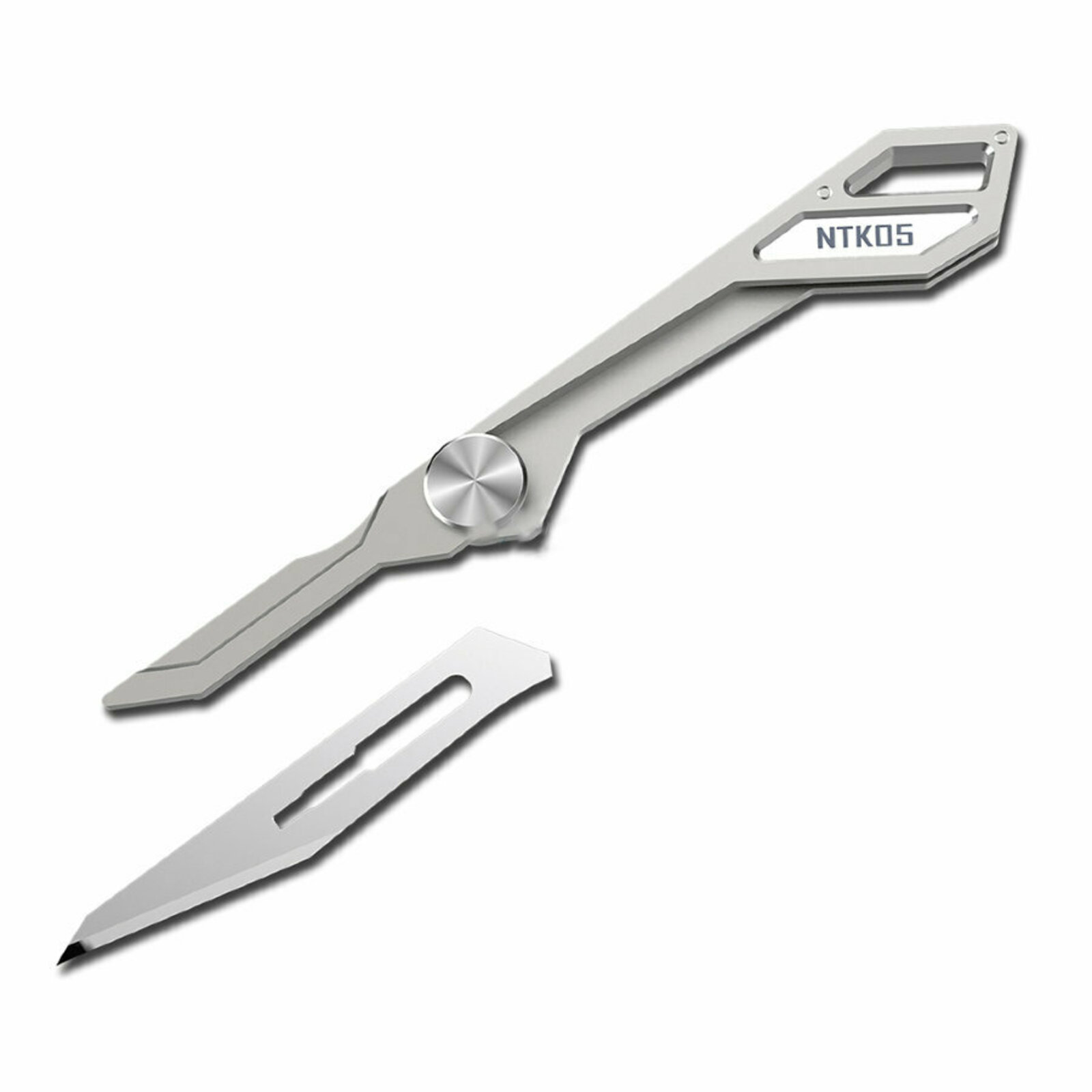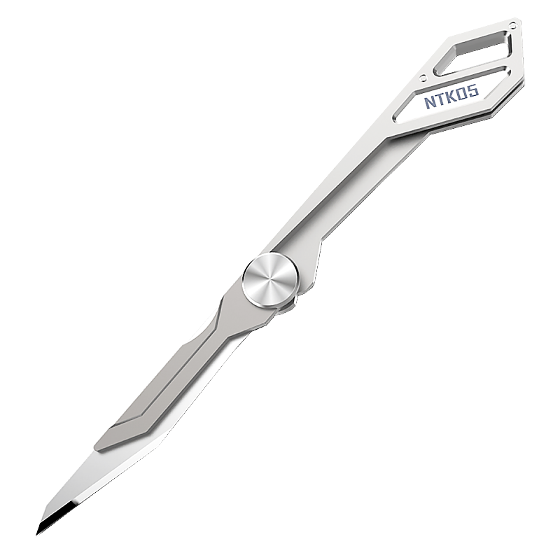 Практичный по всем возможным параметрам NTK05 оснащен небольшим лезвием, похожим по форме на скальпель. Часть лезвия ближе к острию выполнена под углом 35°, что обеспечивает плавный рез, и обладает идеальной заточкой. Остальная часть лезвия придает ему жесткости. Специальное отверстие на нем служит для его извлечения из рукояти и подходит для крепления на наключном кольце или темляке. Лезвие изготовлено по технологии поэтапного процесса плавки и затачивания, гарантирующего лучшее среди аналогов качество и невероятную остроту режущей кромки.