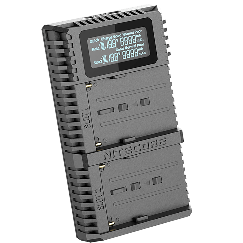 Интеллектуальное зарядное устройство от компании Nitecore – USN3 PRO . Данное устройство поддерживает зарядку исключительно элементов питания от техники Sony: NP-FM500H, NP-F730, NP-F750, NP-F770, NP-F970, NP-F550. Перечисленные типы аккумуляторов используются не только для работы фото-, но и видеотехники с поддержкой подсветок. USN3 PRO обеспечивает полный контроль зарядного процесса, начиная с установки и заканчивая автоматически отключенным по завершении.