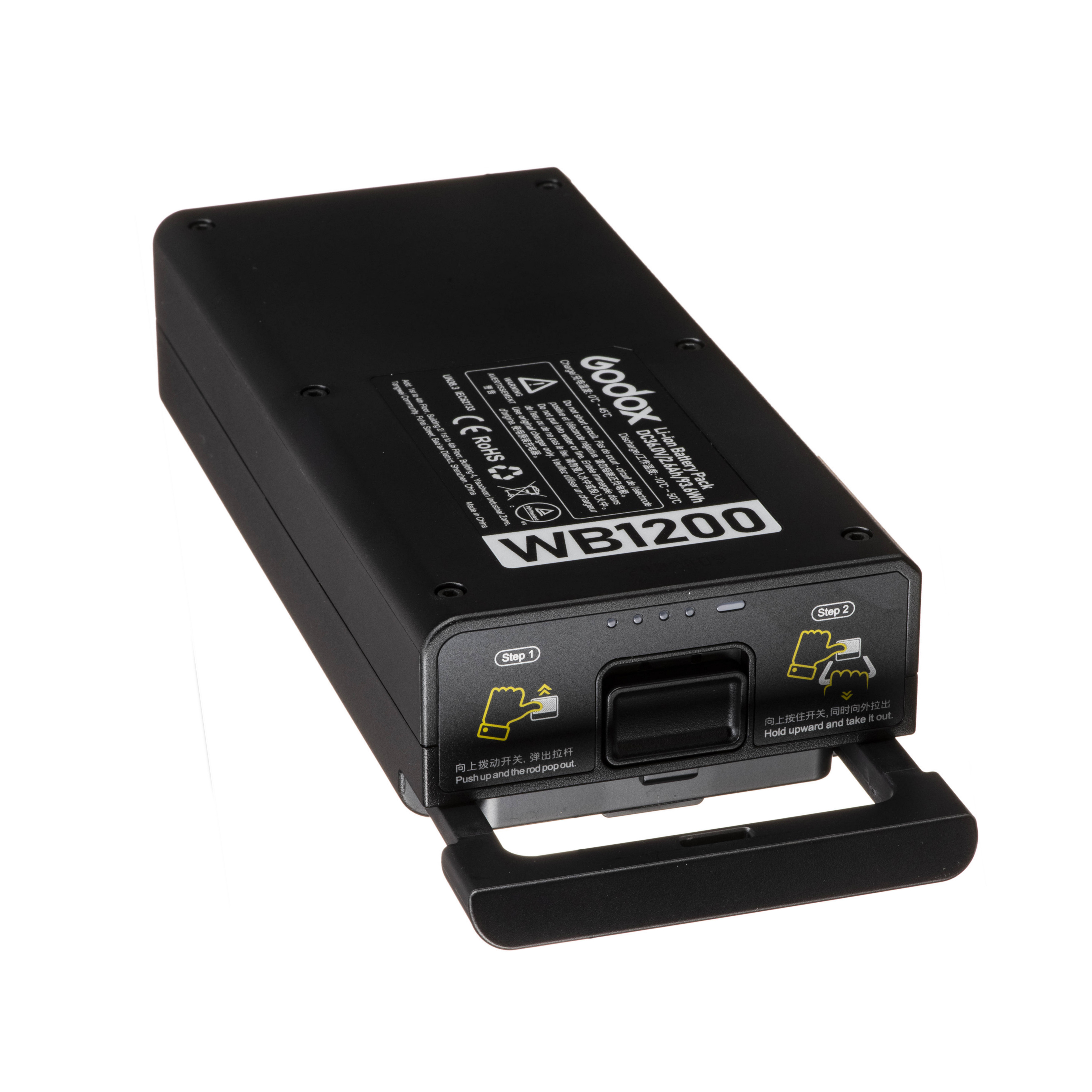 Литий-ионная батарея WB1200 предназначена для питания аккумуляторной вспышки Godox Witstro AD1200Pro, обеспечивает 250 импульсов на полной мощности (при комнатной температуре). Допустимая температура воздуха при эксплуатации -10°… +40°С.