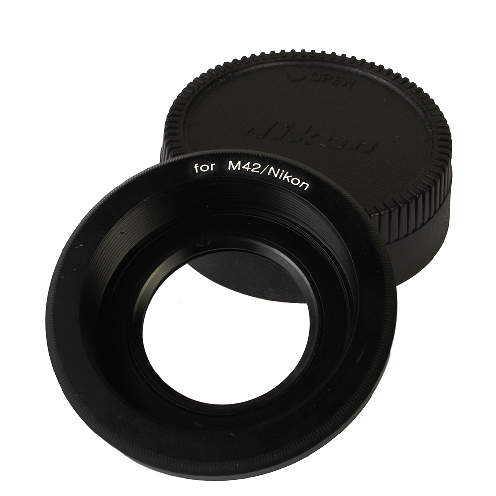 Переходное кольцо M42 на Nikon с линзой, позволяет устанавливать объективы с резьбой М42 (рабочий отрезок 45,5 мм) на фотоаппараты с байонетом Nikon F (рабочий отрезок 46,5 мм). Рабочий отрезок камеры Nikon больше чем рабочий отрезок объективов с резьбовым креплением М42, установленная линза компенсирует разницу рабочих отрезков и обеспечивает возможность фокусировки на бесконечность. Данная модель не имеет электронных контактов, в связи с чем отсутствует подтверждение фокусировки. Работает с режимами М или Av, камера выберет выдержку под установленную вручную на объективе диафрагму. Фокусировка и управление диафрагмой производятся в ручном режиме.