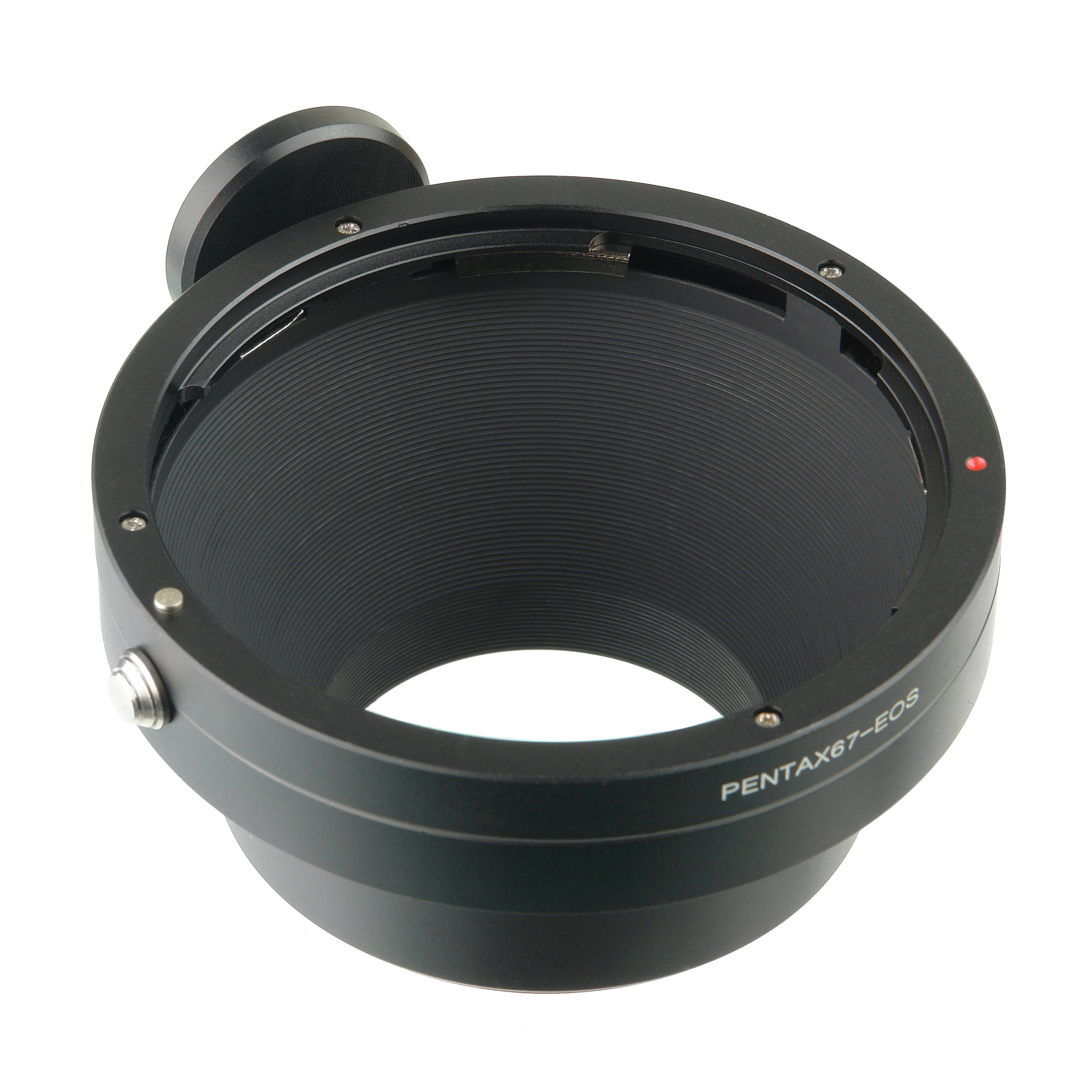 Переходное кольцо Pentax 67 на Canon EOS позволяет устанавливать объективы с байонетом Pentax 67 (рабочий отрезок 84,95 мм) на фотоаппараты с байонетом Canon EF/EF-S (рабочий отрезок 44 мм), с обеспечением фокусировки на бесконечность. Данная модель не имеет электронных контактов, в связи с чем отсутствует подтверждение фокусировки. Работает с режимами М или Av, камера выберет выдержку под установленную вручную на объективе диафрагму. Фокусировка и управление диафрагмой производятся в ручном режиме, объективы без кольца диафрагмы могут быть использованы только с максимально открытой диафрагмой. Для безопасного использования адаптера с тяжелыми объективами конструкция предусматривает крепление для установки на штатив.