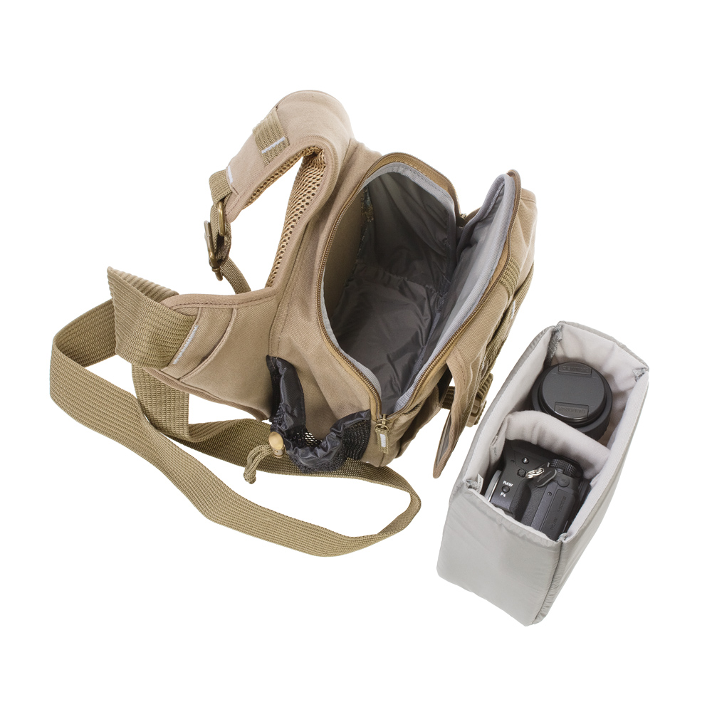 Основное отделение на молнии, обеспечивает быстрый доступ к содержимому и предотвращает попадание воды, песка и пыли. Внутри отделения находятся регулируемые перегородки на липучках, которые образуют отсеки и позволяют эффективно разместить фототехнику. При необходимости перегородки можно легко убрать, освободив большое внутреннее пространство, или переставить — для организации отсеков нужного размера. С внешней стороны сумки, под крышкой с защелкивающейся пряжкой, размещается карман с отсеками для аксессуаров.