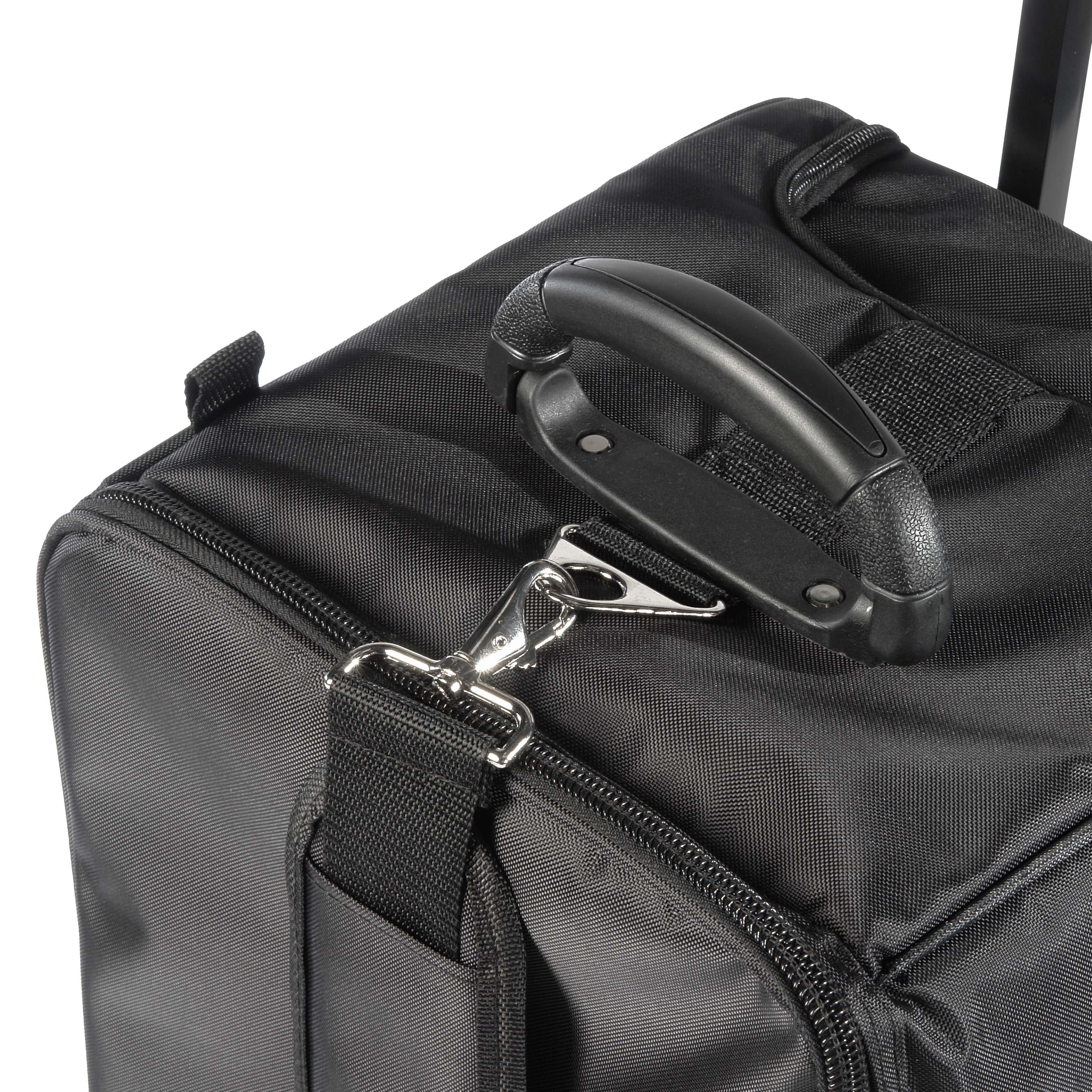 Сумка оснащена крепкими ручками для переноски, которые можно соединить между собой стяжкой на липучке. Широкий наплечный ремень, два колеса на основании, удобная выдвижная ручка, а также пластиковая складная ручка для перевозки обеспечивают максимальное удобство при использовании.