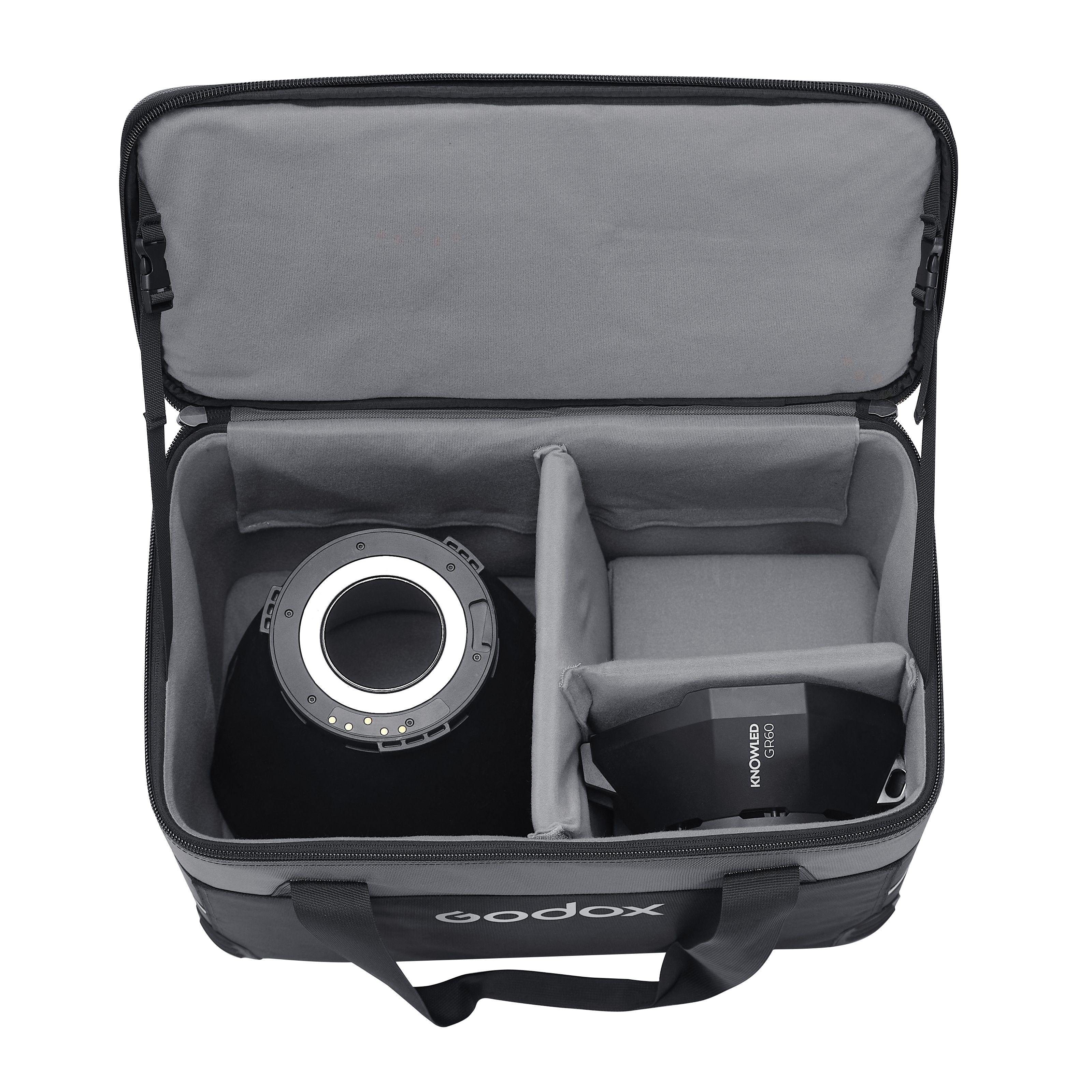 Godox Knowled GF14 оснащена двумя ручками для переноски, прорезиненными ножками и карманом для багажной биркой для максимального комфорта на выездных съемках и для хранения в студии.