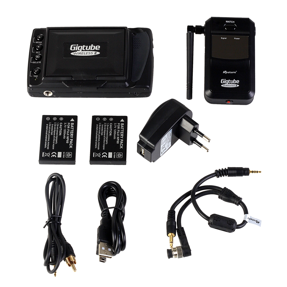 Приемник Aputure Gigtube Wireless II принимает сигнал на расстоянии до 100 м (на открытом пространстве), 4 радиоканала позволяют работать с четырьмя камерами (необходимо иметь четыре передатчика, приобретаются отдельно). Частичное нажатие на двухпозиционную кнопку активизирует автофокус, полное нажатие производит фотографирование. Дисплей с диагональю 3,5 дюйма, разрешением 320х240 пикселей и цветопередачей в 16 миллионов цветов, защищен быстросъемной блендой. Приемник с ЖК экраном оборудован видеовыходом, который позволит вывести изображение практически на любой внешний монитор или телевизор с разъемом RCA ("тюльпан").