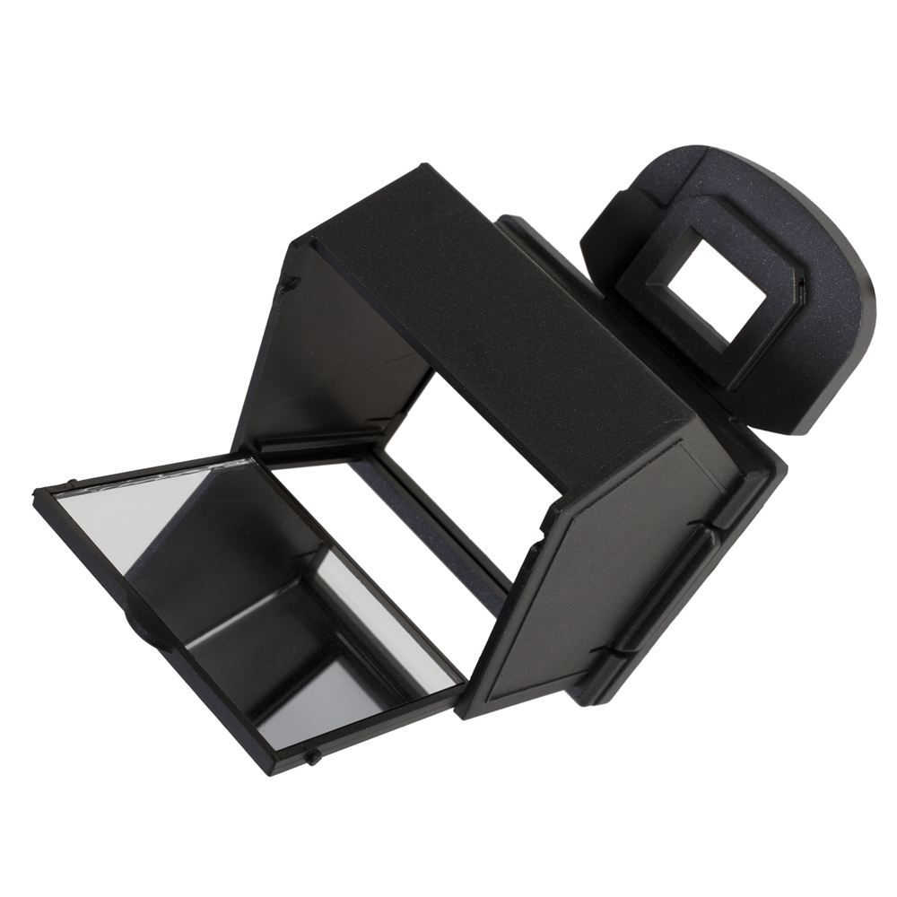 Второй насадкой является угловой видоискатель ЖК монитора. С помощью системы зеркал позволяет повернуть изображение под углом 90˚ и увидеть отражение ЖК-монитора непосредственно над камерой. Это удобно при макросъемке, съемке с крайних нижних точек (когда трудно получить доступ к экрану низко расположенного фотоаппарата) и съемке событий происходящих сверху - птицы в полете, самолеты, парашютисты и т.д.