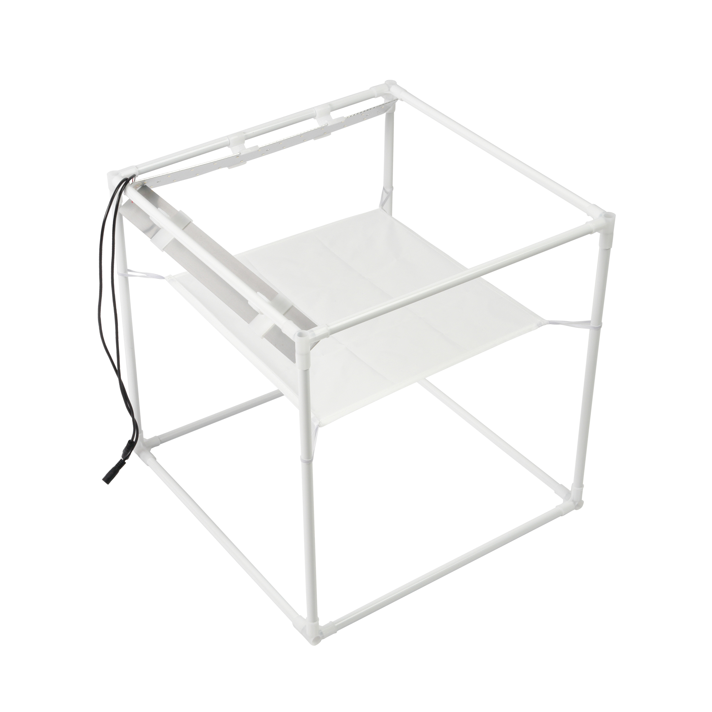 Прочный каркас фотобокса собирается из стальных трубок, скрепляющихся между собой при помощи пластиковых угловых соединителей. Сверху на каркас одевается тент с текстурной светоотражающей внутренней поверхностью и застегивается на «молнию». Подготовка к съемке занимает несколько минут, а использовать фотобокс сможет даже не имеющий специальных знаний человек.