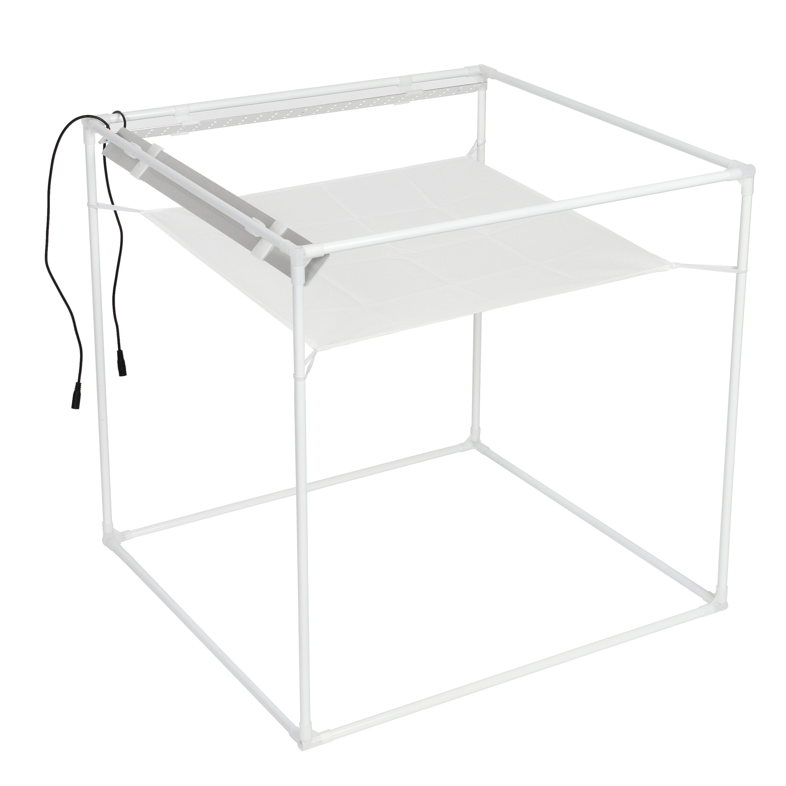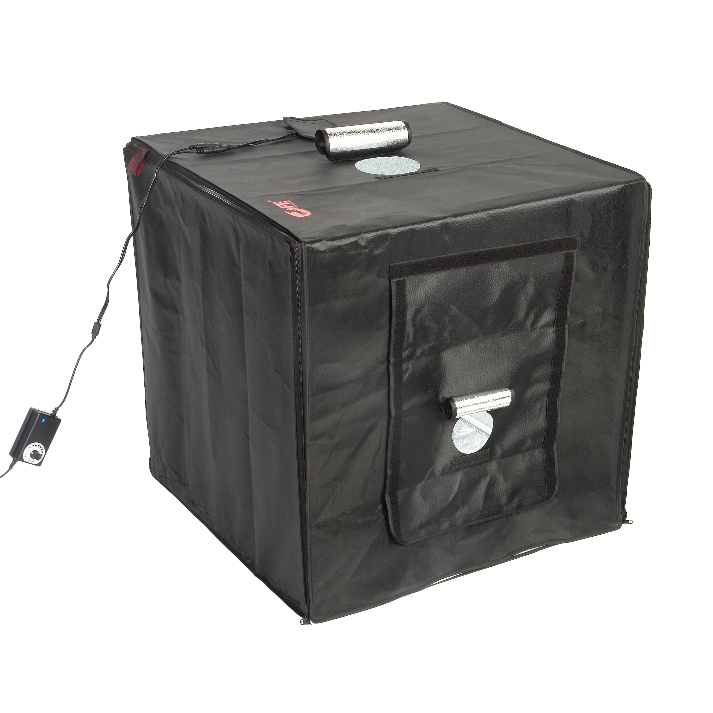 Прочный каркас фотобокса собирается из стальных трубок, скрепляющихся между собой при помощи пластиковых угловых соединителей. Сверху на каркас одевается тент с текстурной светоотражающей внутренней поверхностью и застегивается на «молнию». Подготовка к съемке занимает несколько минут, а использовать фотобокс сможет даже не имеющий специальных знаний человек.