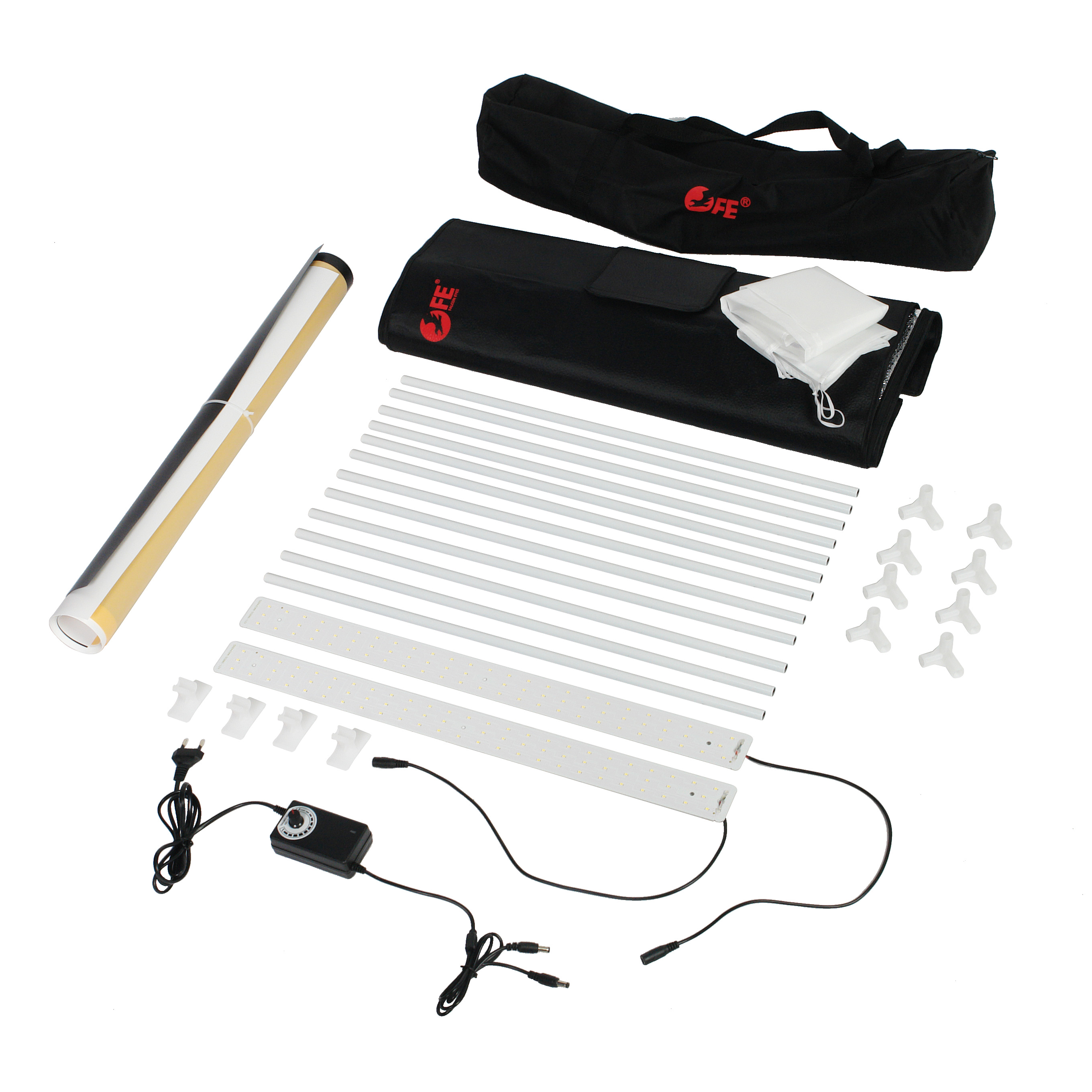 Освещение фотографируемых предметов осуществляется двумя съемными светодиодными панелями общей мощностью 40 Вт по 72 светодиода каждая, которые крепятся к каркасу корпуса на клипсах. Диммер, размещенный на кабеле питания устройства, позволяет плавно регулирующий мощность двух осветительных панелей одновременно.