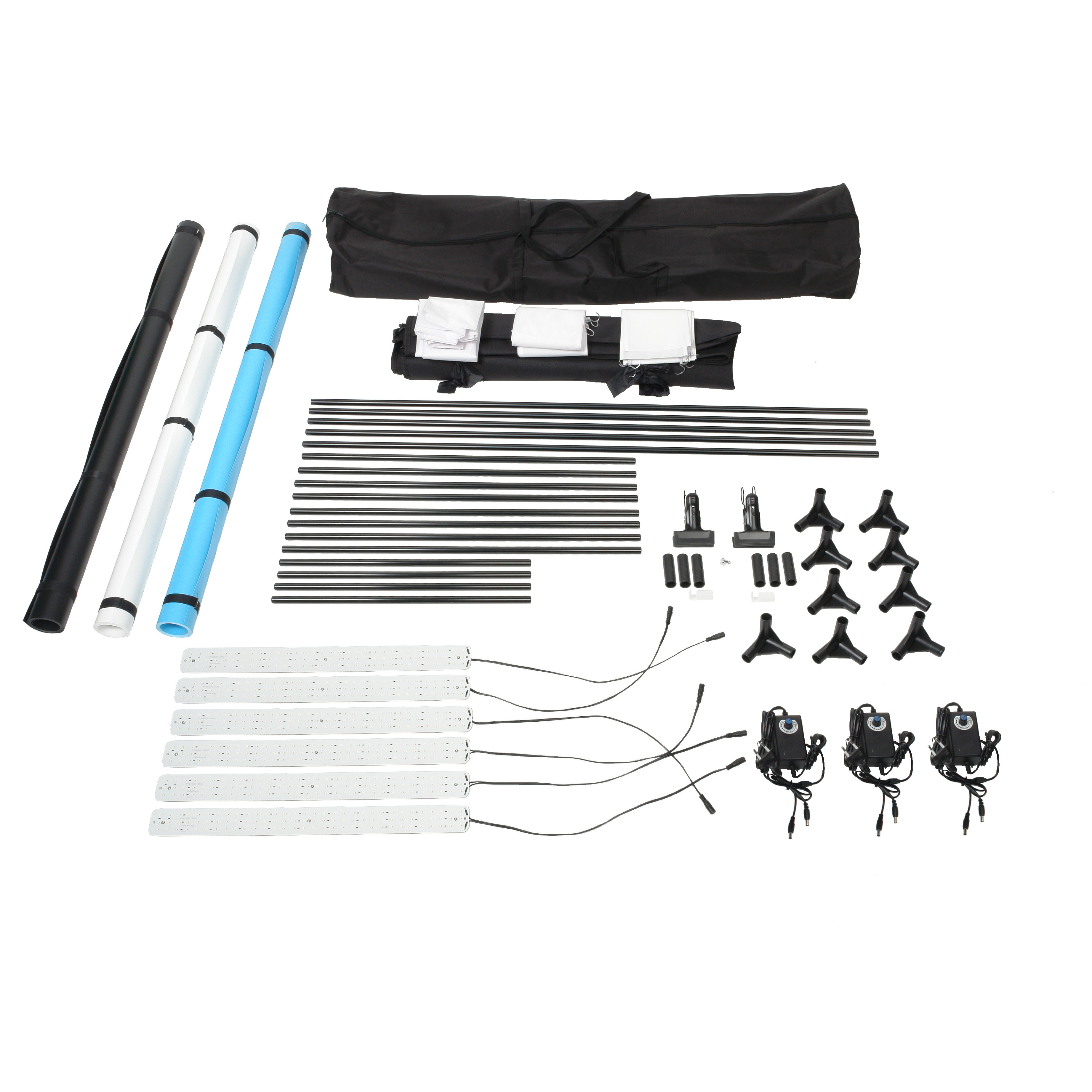 Светодиодные осветители крепятся на трубки каркаса с помощью мощных магнитов по двум боковым и одной верхней грани фотобокса. Питание светодиодных линеек осуществляется от сетевого адаптера, провод к которому продевается в отверстии тента. К одному адаптеру подключается две линейки одновременно. Для создания заполняющего света от линеек в комплекте предусмотрены два рассеивателя, крепление которых осуществляется к трубкам каркаса за счёт металлических крючков на резинке.