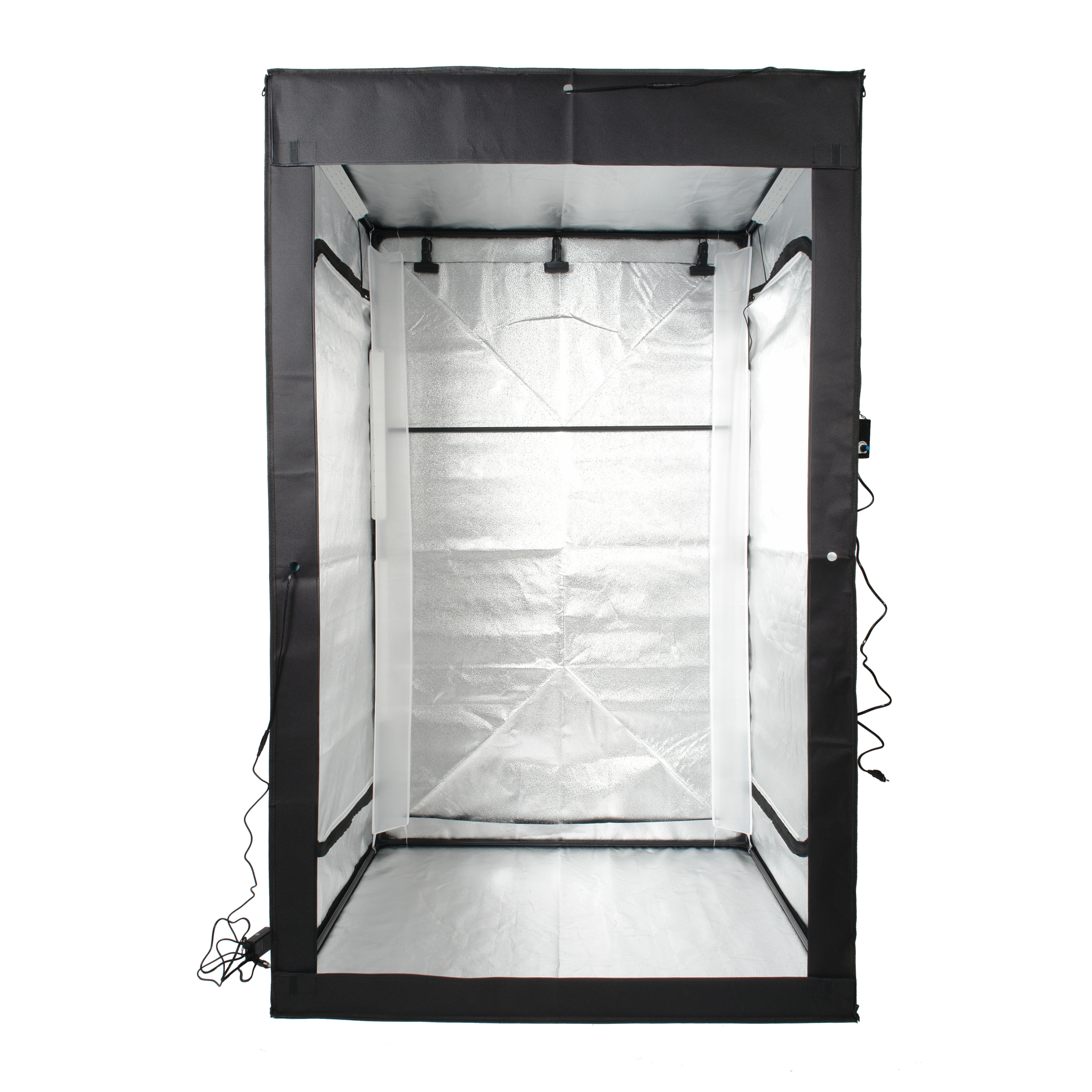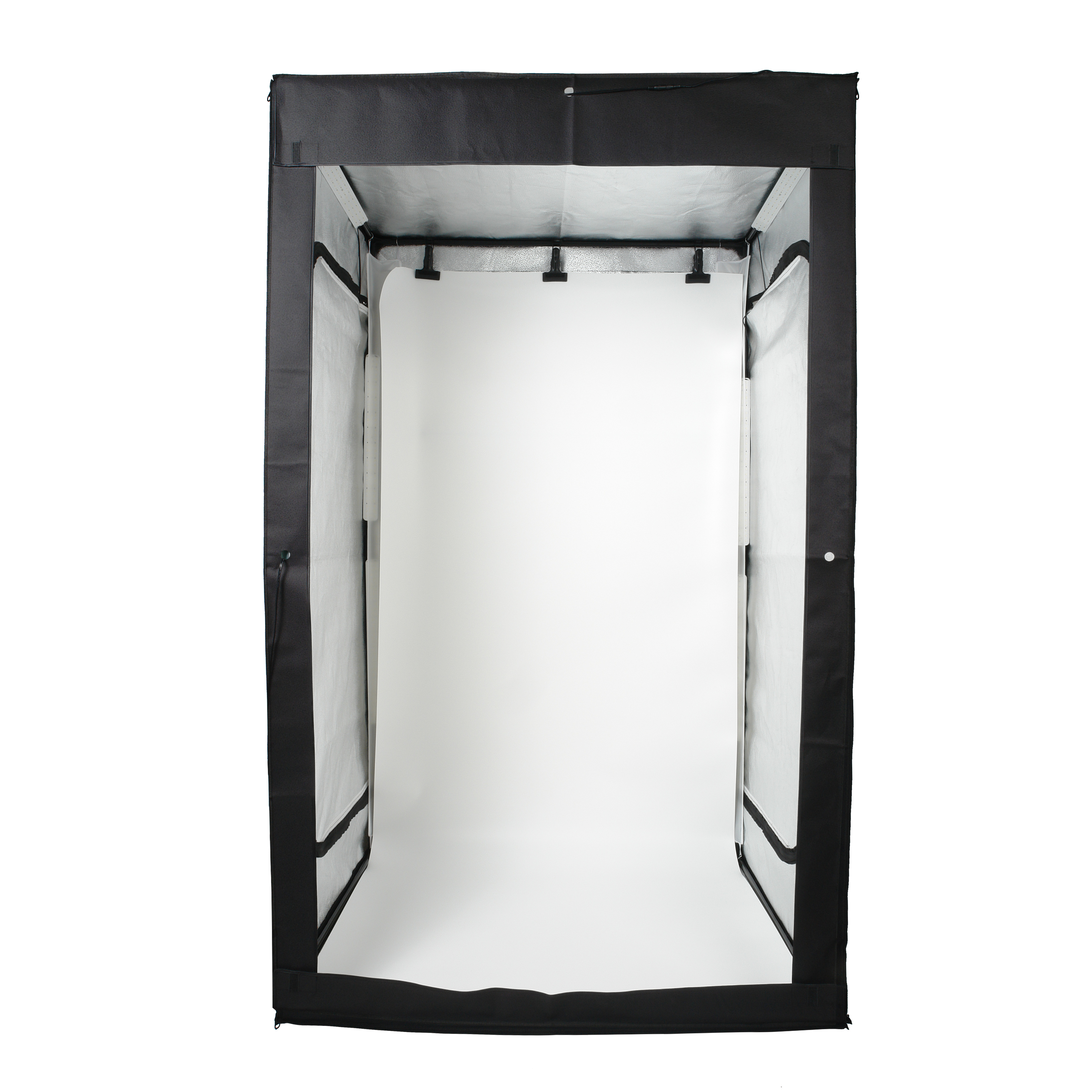 Светодиодные линейки расположены по периметру осветителя внутри корпуса. Серебристые внутренние отражающие поверхности, быстросъёмные рассеиватели и постоянная яркость источников света создают интенсивное равномерное освещение и дают возможность проводить съёмку, не меняя каждый раз настройки фотоаппарата или камеры смартфона. Размер фотобокса позволяет фотографировать модель в полный рост.