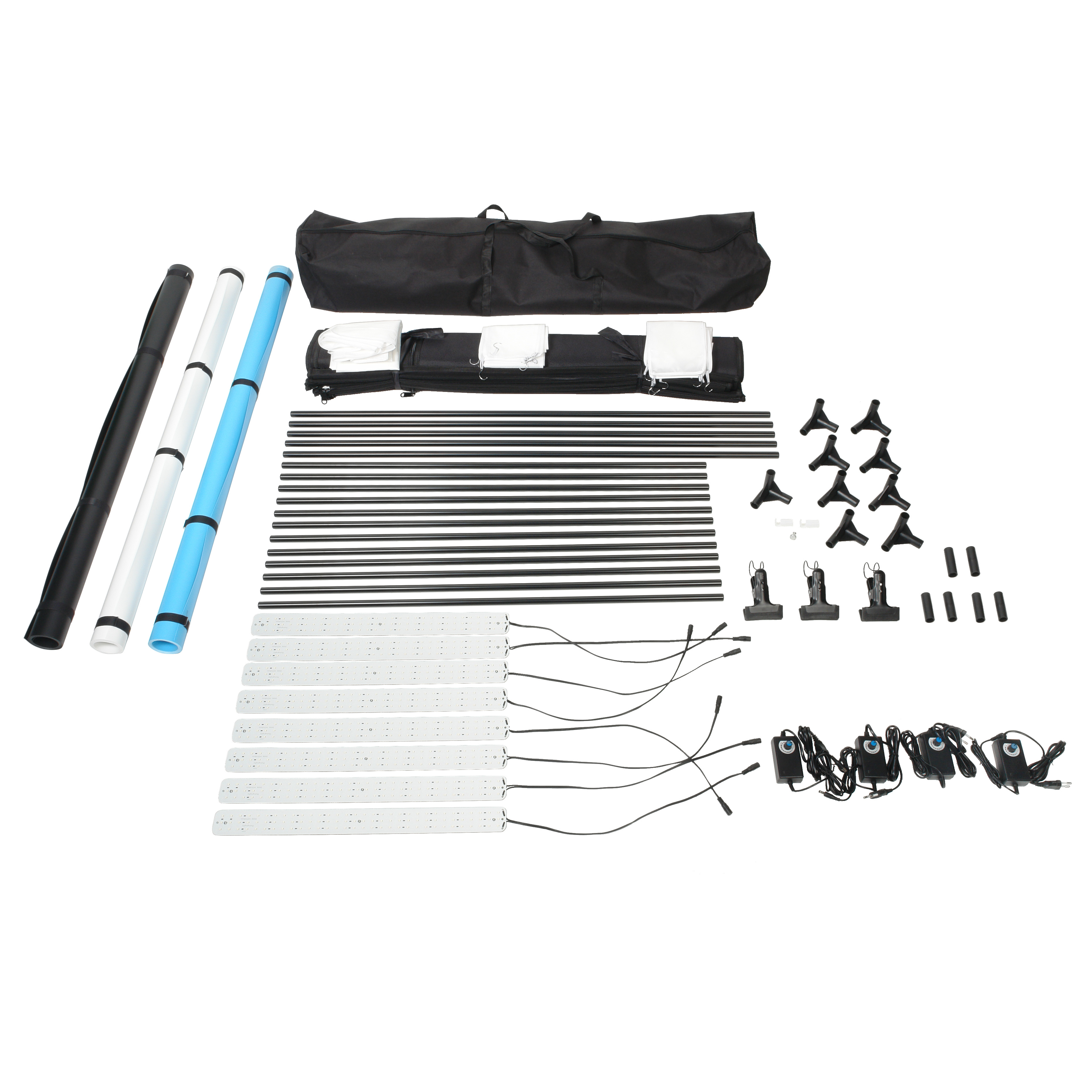 Светодиодные осветители крепятся на трубки каркаса с помощью мощных магнитов по двум боковым и одной верхней грани фотобокса. Питание светодиодных линеек осуществляется от сетевого адаптера, провод к которому продевается в отверстии тента. К одному адаптеру подключается две линейки одновременно. Для создания заполняющего света от линеек в комплекте предусмотрены два рассеивателя, крепление которых осуществляется к трубкам каркаса за счёт металлических крючков на резинке.