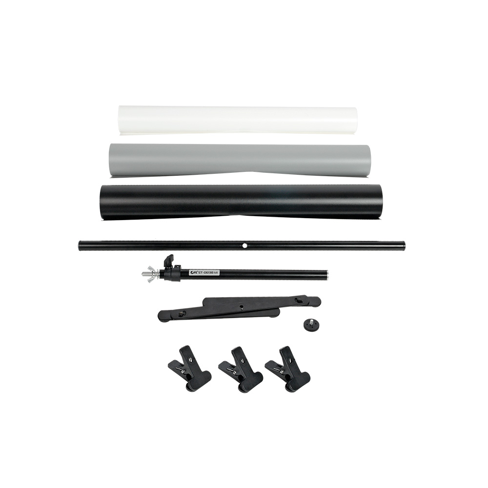 В комплекте Falcon Eyes BGK-0613 предусмотрено три пластиковых полуматовых фона размер которых составляет 132 х 63 см. Толщина фона около 0.5 мм. Материал фонов водоотталкивающий — его можно использовать при съёмке жидкостей, не боясь его повредить. Цвета фонов: чёрный, белый и серый.