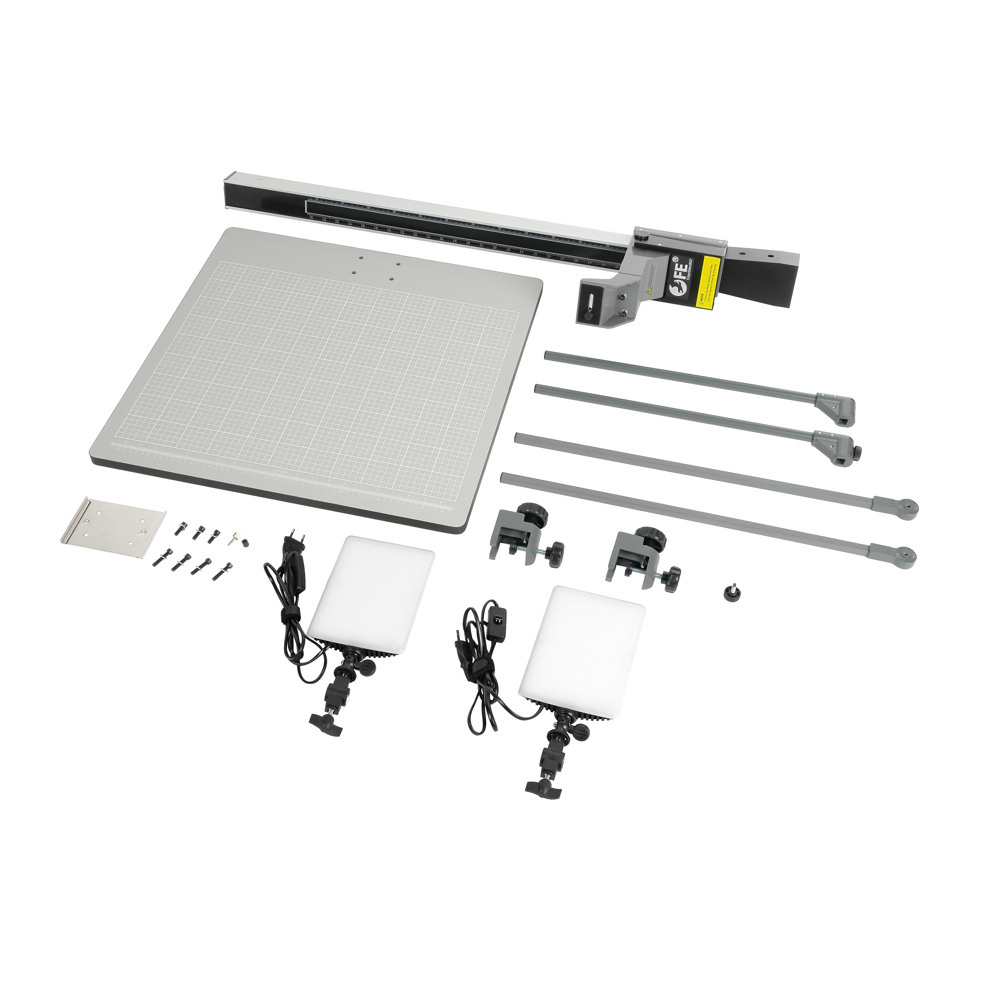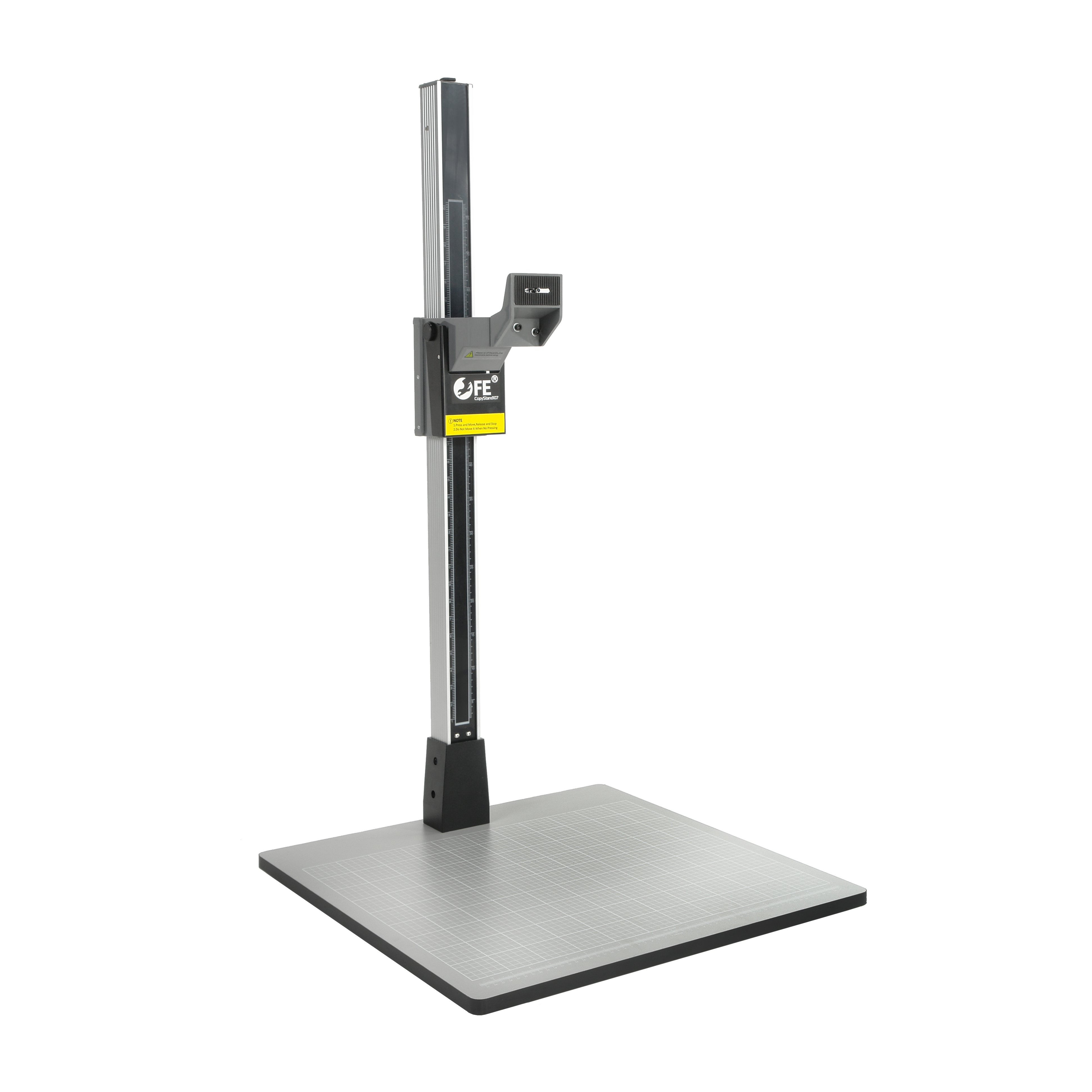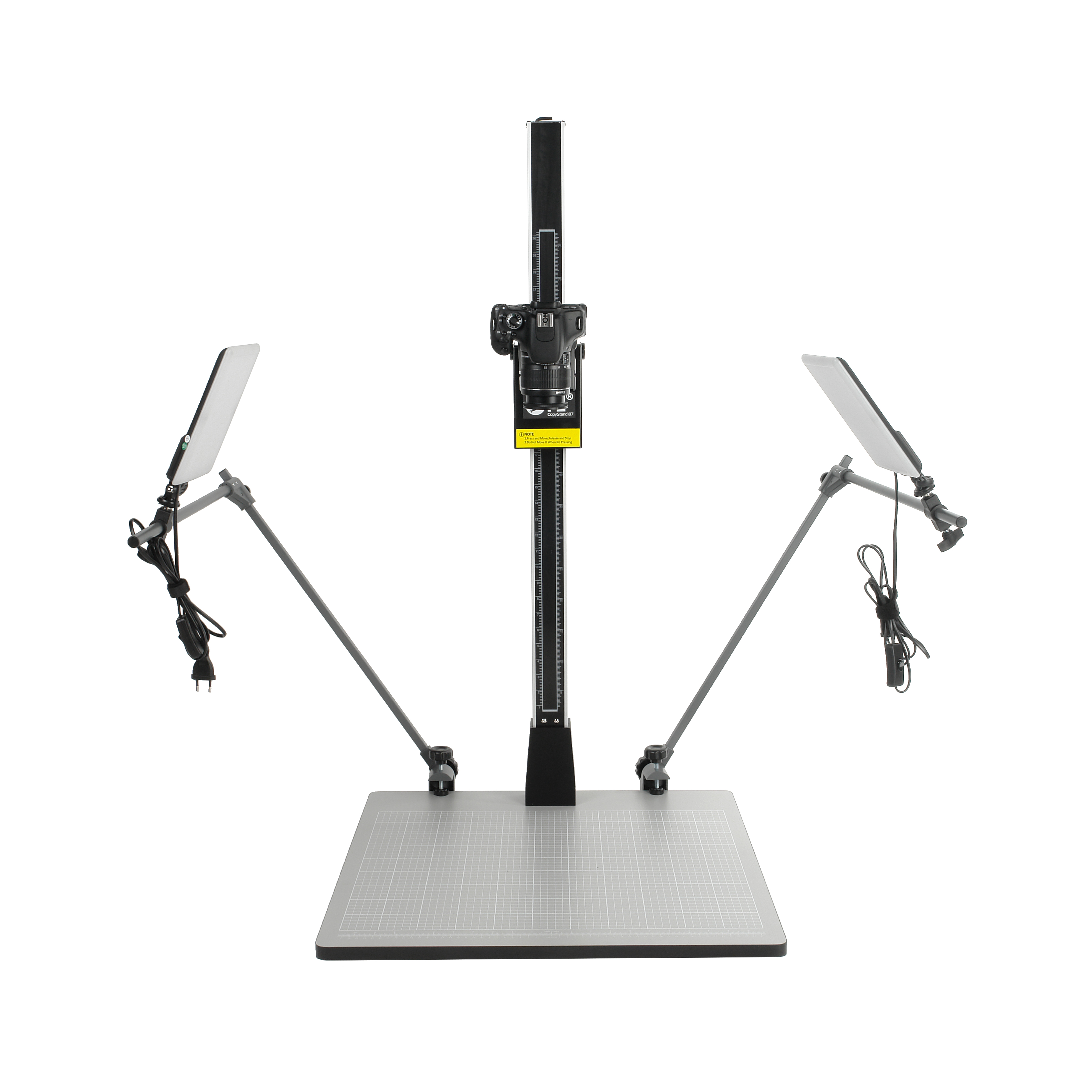 Прочное основание с масштабной сеткой. Прочная плита основания размером 60х60см из ламинированного ДСП с антибликовым серым матовом покрытием, на котором напечатана масштабная сетка 55х45 см и размерная шкала в сантиметрах и дюймах. Сетка и шкала помогают точно и последовательно выравнивать положение объектов, а также определять величину запечатленных объектов и проводить сравнительные замеры.