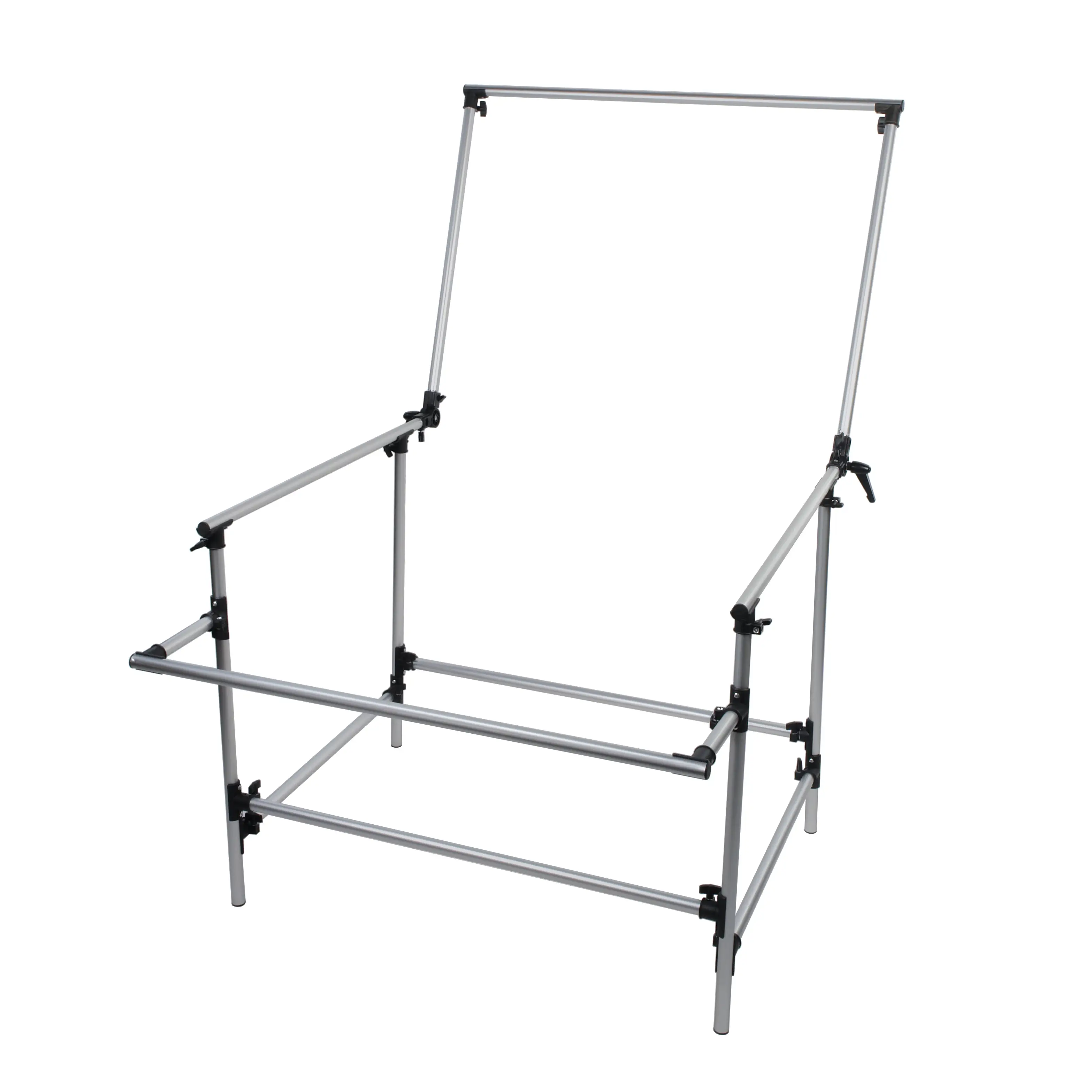 Сборный каркас из алюминиевого сплава с трубками диаметром 25 мм собирается на винтовых зажимах без специального инструмента. Ключевой особенностью является шарнирное крепление спинки, позволяющее плавно менять ее угол от 90° (вертикальный фон) до 180° (полностью горизонтальное положение). Высота рабочей поверхности стола составляет 78 см — оптимальный уровень для комфортной работы с оборудованием и объектами.