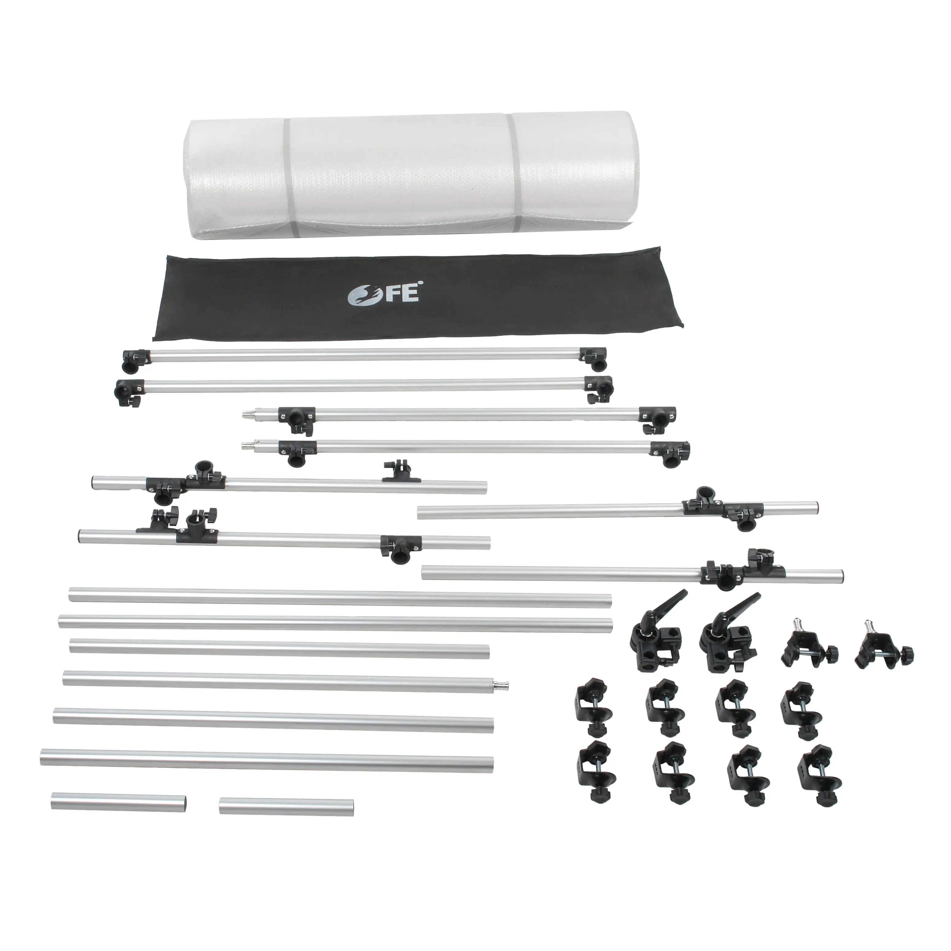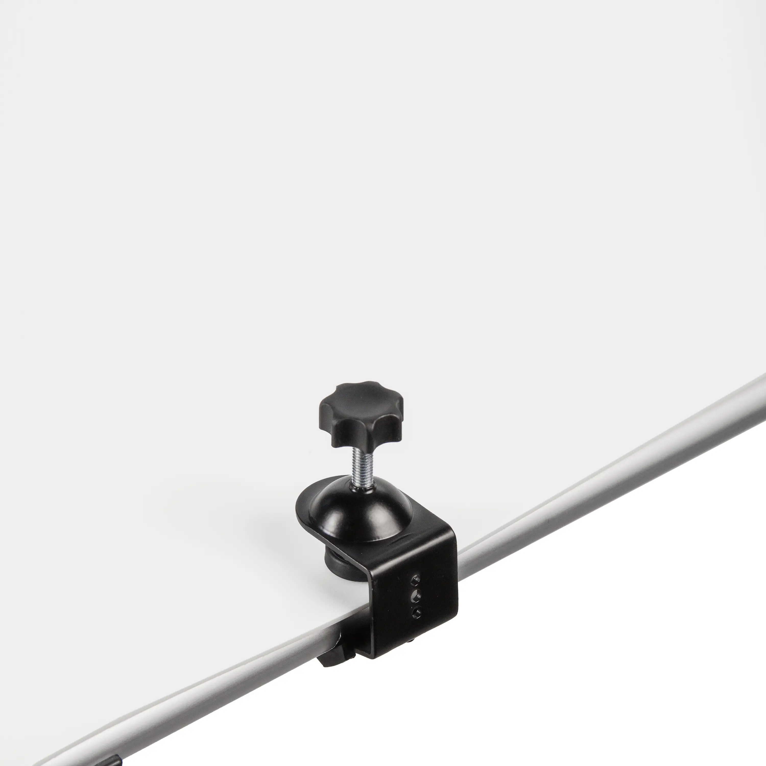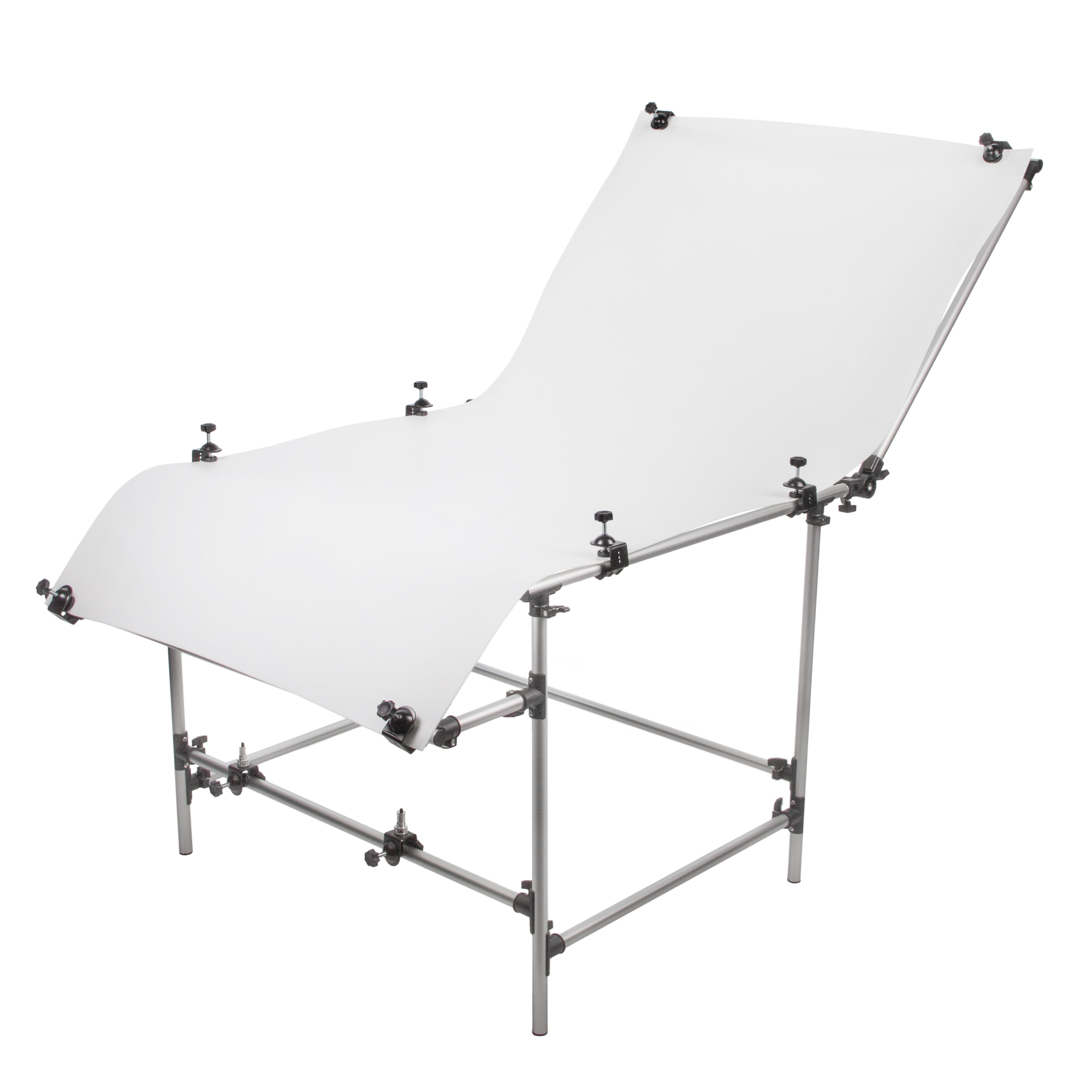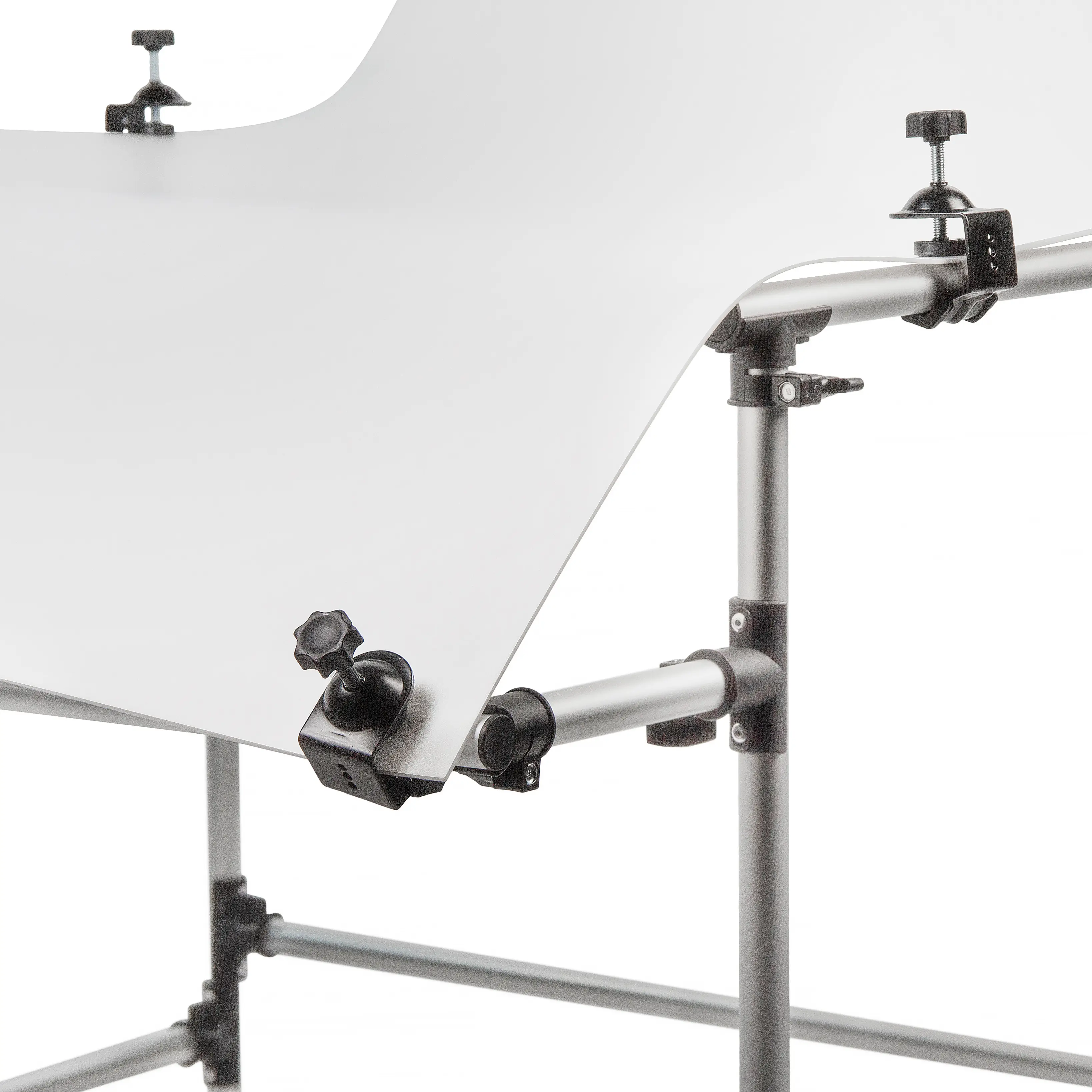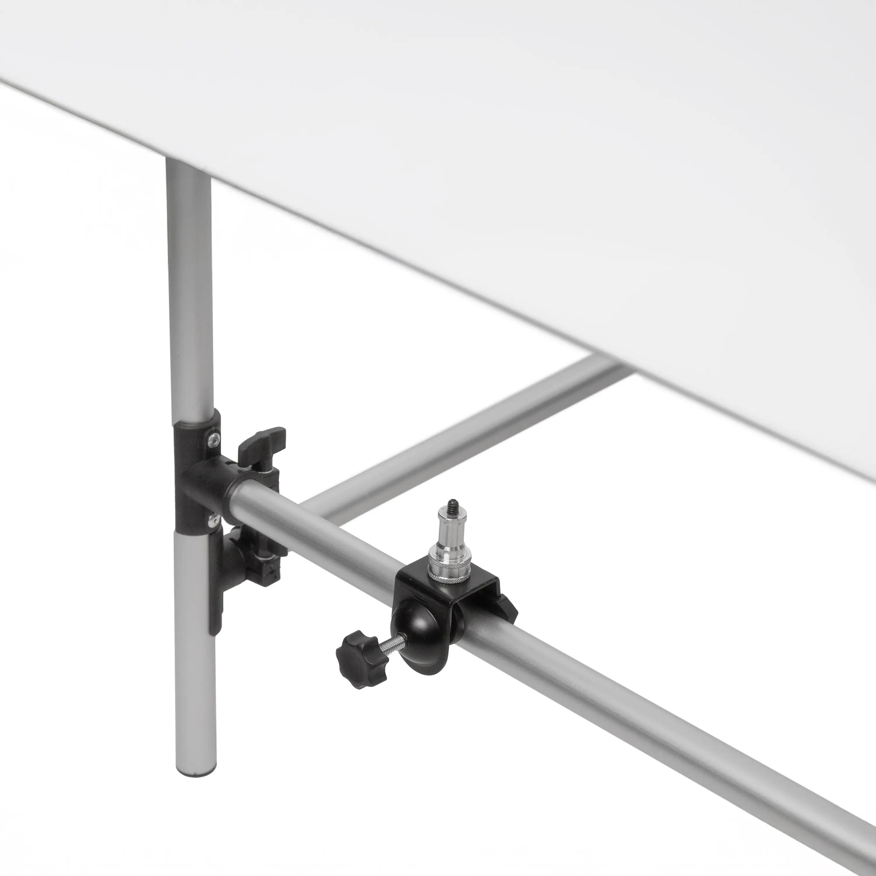 В набор входят два специальных зажима с адаптером типа Baby Pin, предназначенных для монтажа на нижнюю поперечную трубку каркаса. Это дает возможность установить осветительные приборы (приобретаются отдельно) снизу для подсветки объектов на просвет через рассеивающее полотно. Для создания классического бестеневого эффекта осветители можно расположить и за спинкой стола, используя полотно как большой рассеиватель.