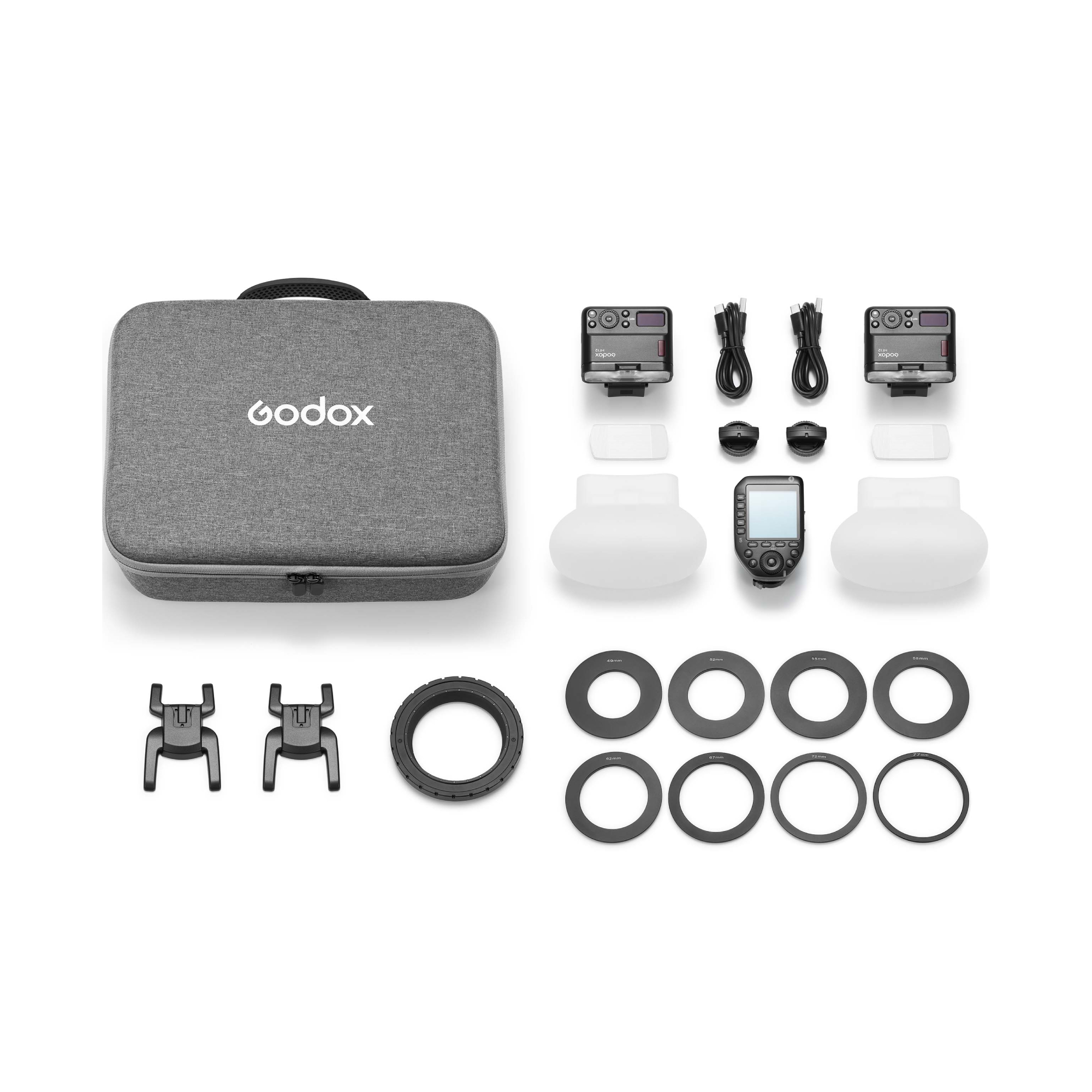 Комплект включает в себя две вспышки Godox MF12, радиосинхронизатор Godox XproII S+ для Sony, комплект переходных колец Godox AR-R Kit и монтажное кольцо Godox MF-R для установки вспышек на объектив фотоаппарата.