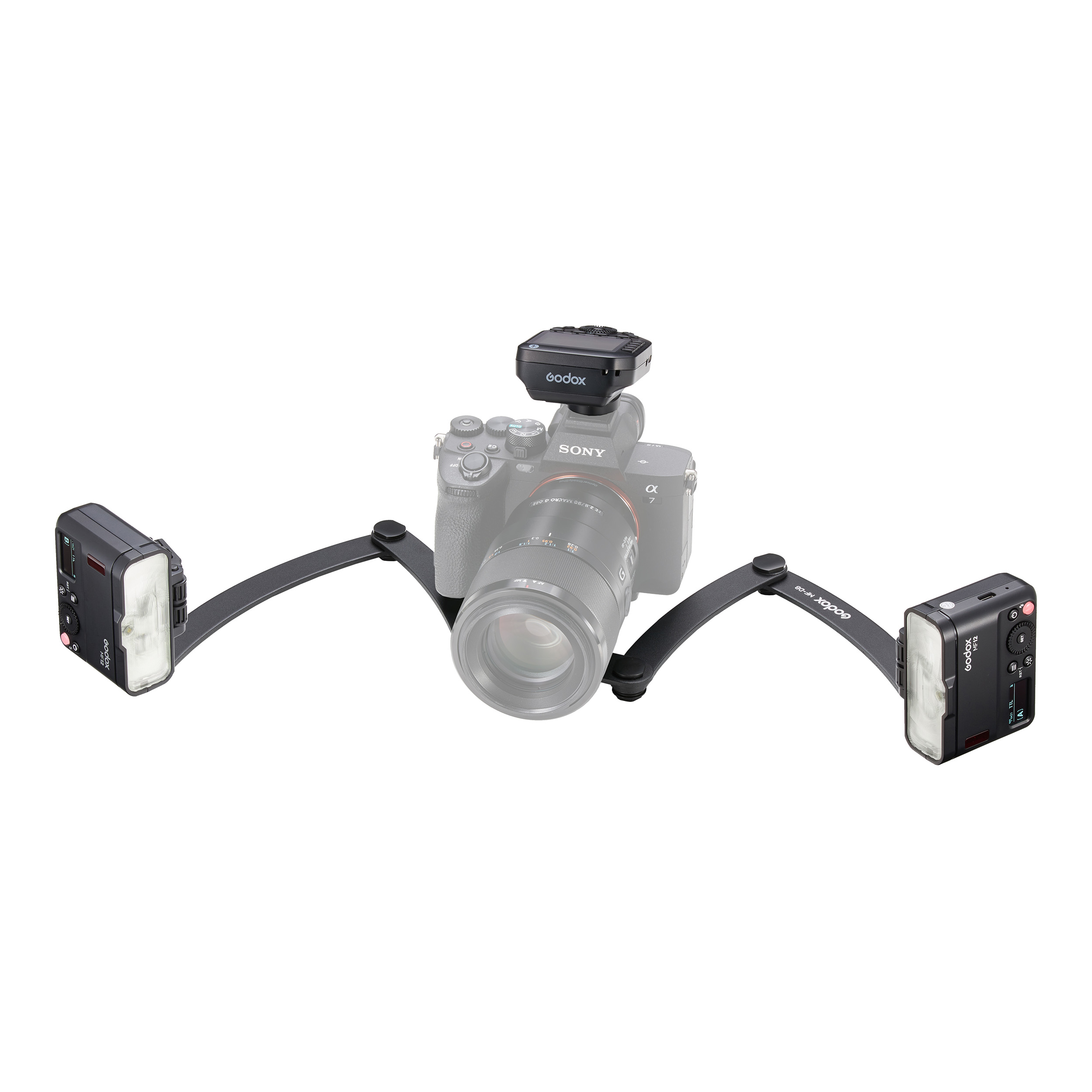 • Комплект из двух вспышек MF12, радиосинхронизатора XproII S+ для Sony и кронштейна MF-DB