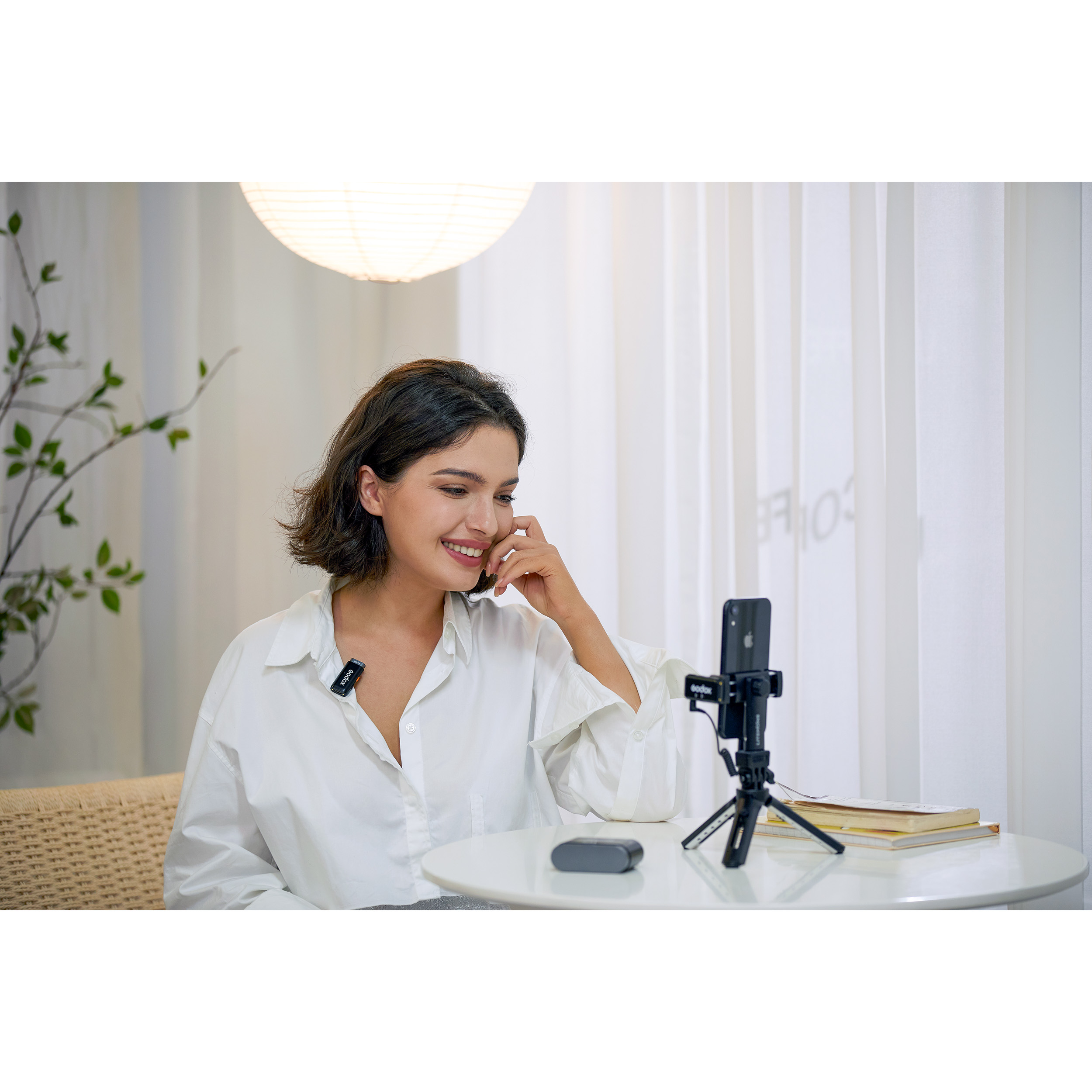 Ультракомпактная и легкая (вес передатчика всего 12 г) радиосистема включает в себя передатчик (TX) со встроенным всенаправленным микрофоном и приемник (RX) с подключением TRS 3,5 мм.