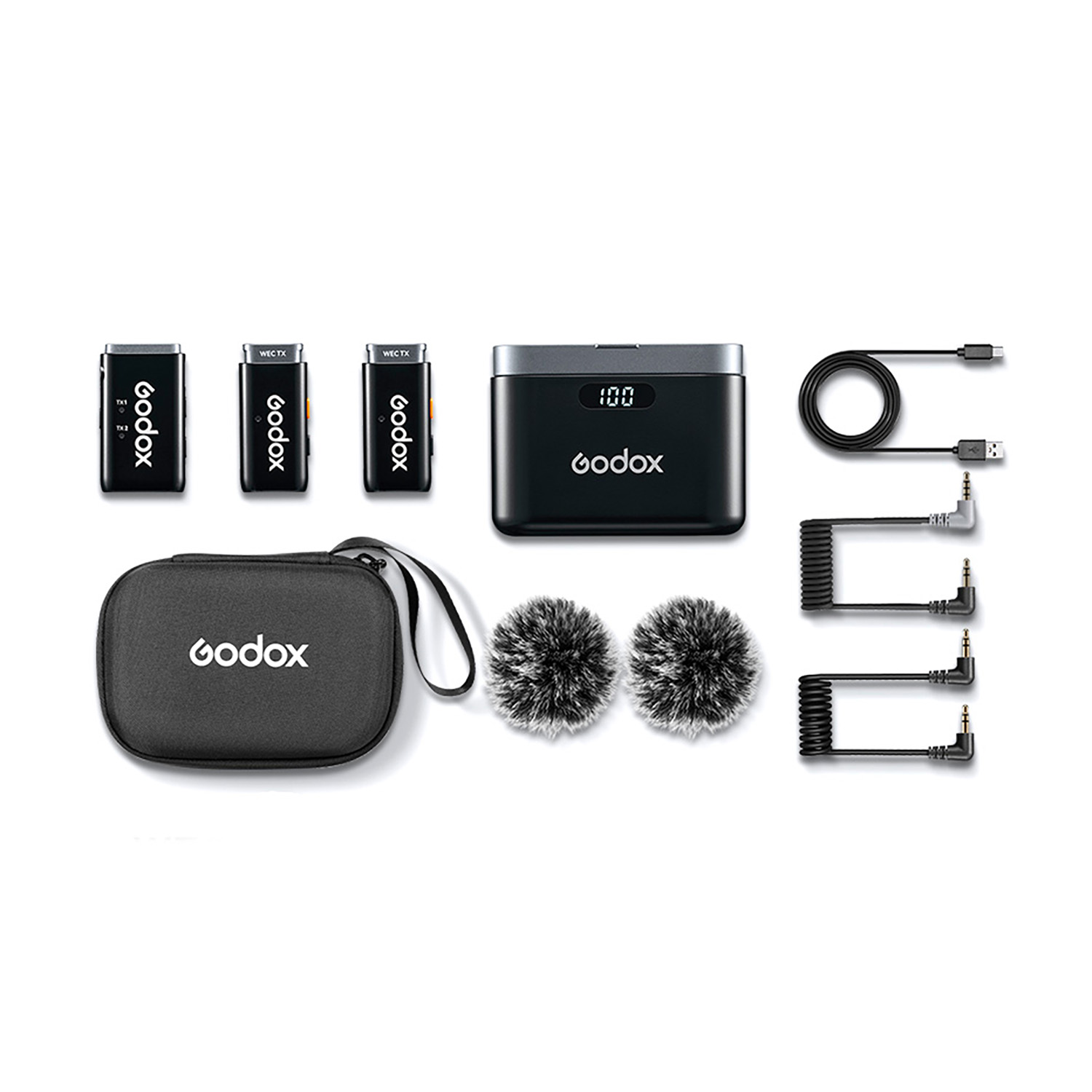 Godox WEC Kit2 – беспроводная радиосистема, состоящая из приемника и двух передатчиков со встроенным микрофоном для записи аудио при съемке видеоконтента в помещении и на улице.
