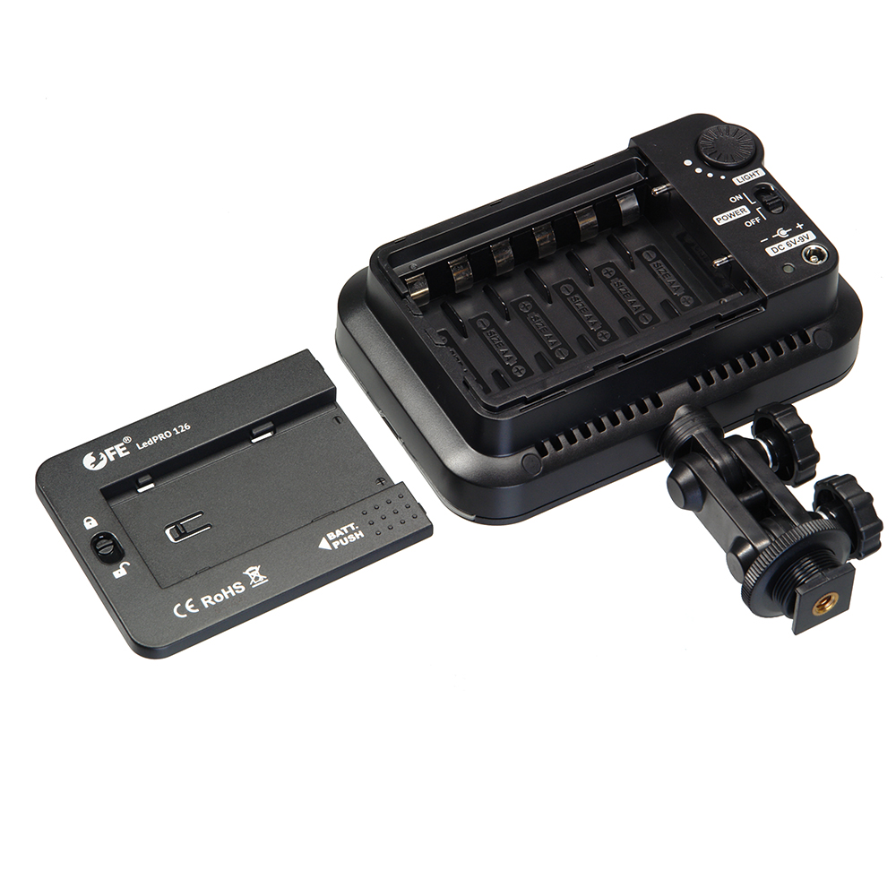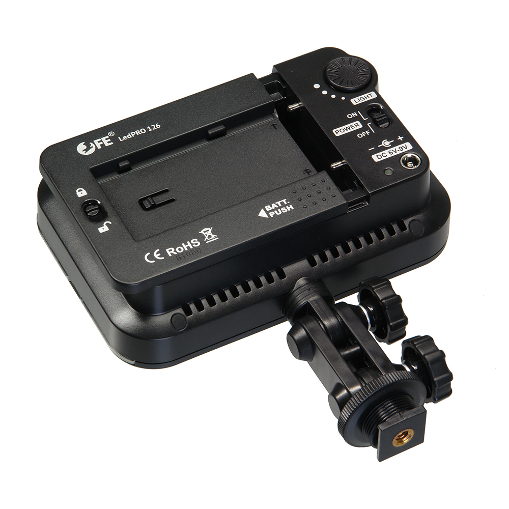 Falcon Eyes LedPRO 126 легкий и компактный светодиодный накамерный осветитель с наклонным кронштейном. 126 высокоэффективных светодиодов генерируют мягкий световой поток без мерцаний с цветовой температурой 5500К ±200К. Технология производства светодиодов обеспечивает визуально точную цветовую температуру без искажений даже при уменьшении яркости. Осветитель предназначен для использования в фото- и видеосъемке, макросъемке, предметной съемке и других видах съемок.
