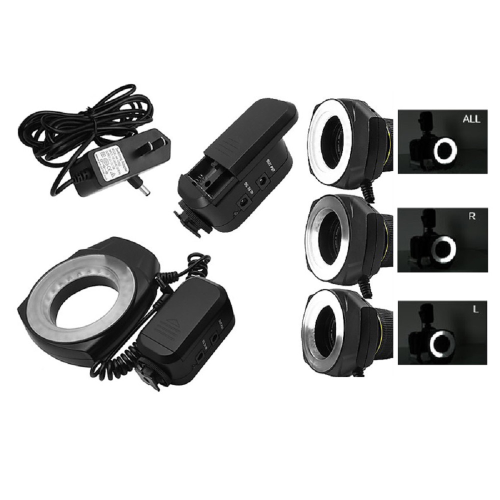 48 светодиодов формируют яркий световой поток, цветовая температура 5500K позволяет сбалансировать цвет с естественным дневным освещением или со вспышками, эффективная рабочая дистанция 3-100 см. Для дополнительного контроля над освещением пользователь может выбирать между режимами: включено всё кольцо, светится только левая сторона или только правая сторона.