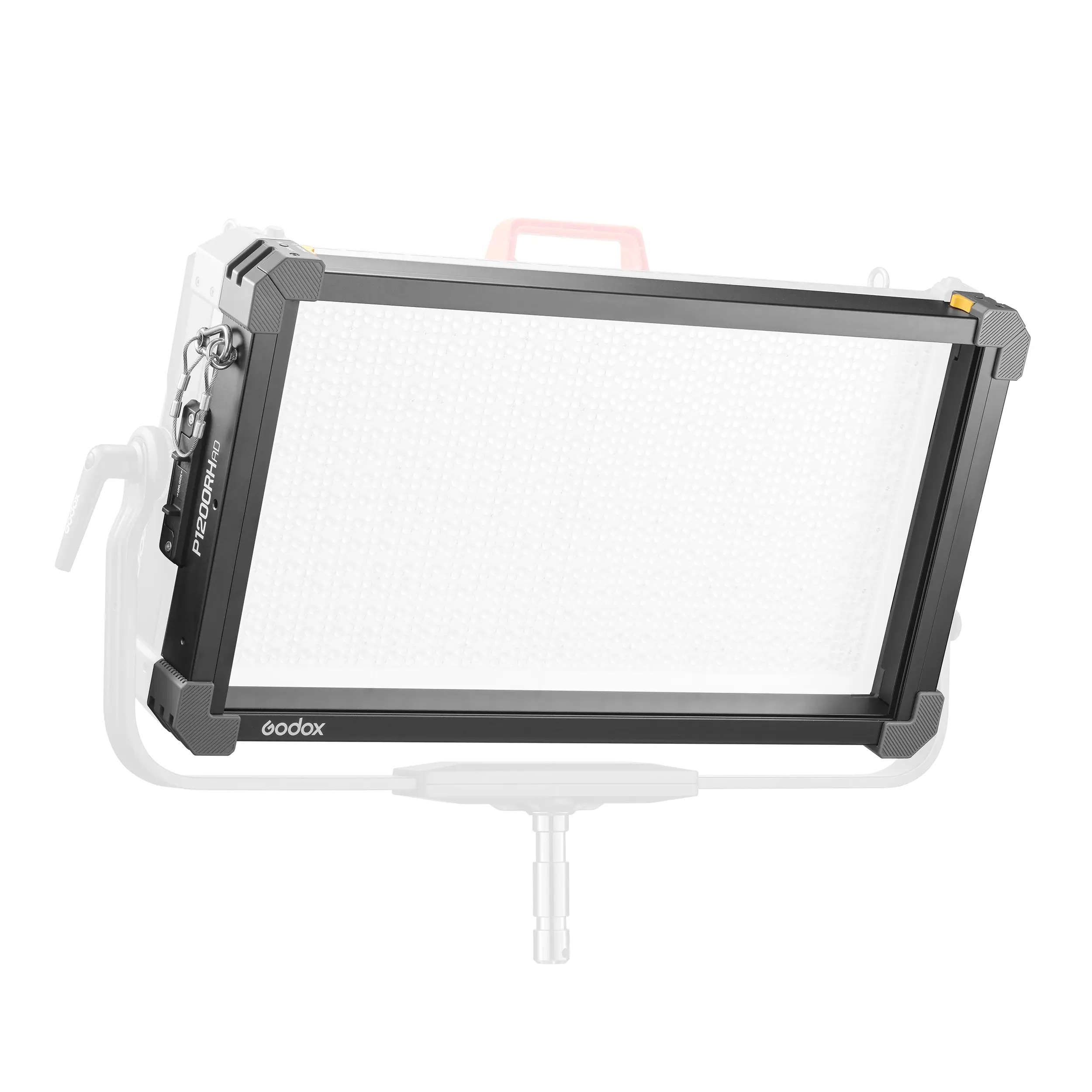 Адаптер Godox Knowled P1200RH AD позволяет использовать со светодиодной панелью P1200R Hard Pro аксессуары от осветителя P600R. Рама из алюминия крепится на переднюю сторону осветителя. Верхняя планка снимается, открывая пазы для установки рассеивателей, сот и других аксессуаров, после чего возвращается на место и фиксируется металлическими защелками. По бокам адаптера расположены крепления для установки на кронштейн.